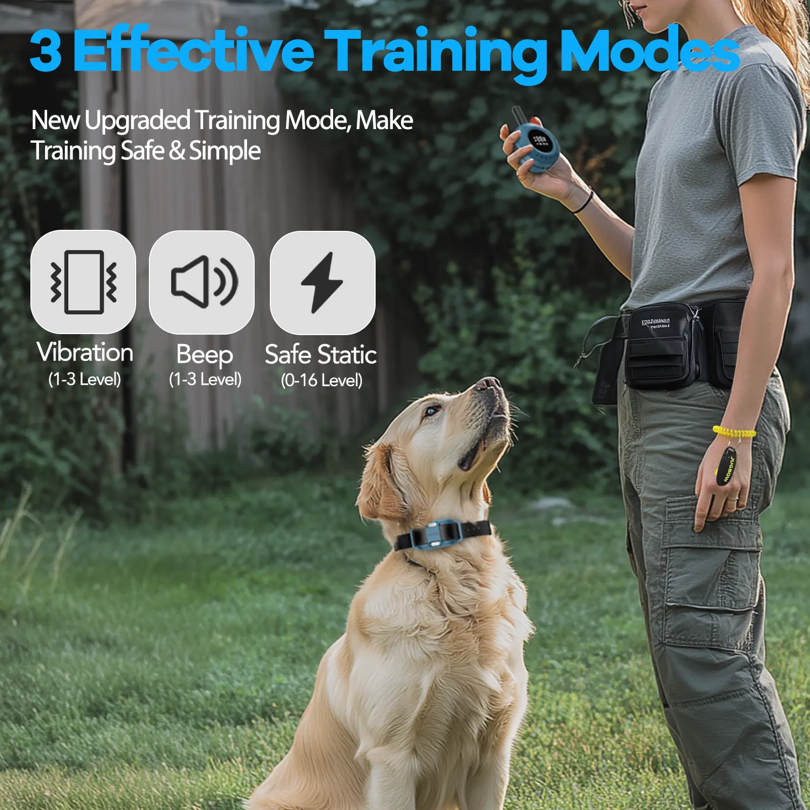 【3 Humanized, Effective, Safe Training Modes】Are you still worried about hurting your dog using a training collar? Our newly upgraded training mode is less likely to cause harm to the dog, making dog training safer. The safe static mode(1-16 levels) has lower intensity and higher frequency, minimizing the dog's skin discomfort while enhancing correction. The upgraded motor structure design for more focused vibration feedback(1-3 levels). The customized tunes allow dogs to recognize and respond to commands quickly(1-3 levels). Includes belt clip, lanyard, and clicker to help better train your dog.