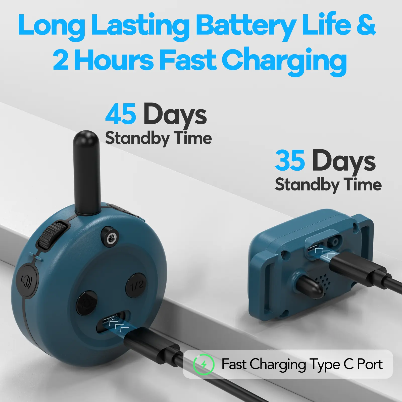 【Incredible Battery Life & Quick Charging】No worries about replacing the batteries. This dog training collar can be charged using 2-in-1 Type C within 2 hours & the collar holds a charge for up to 35 days of standby time and the remote 45 days!