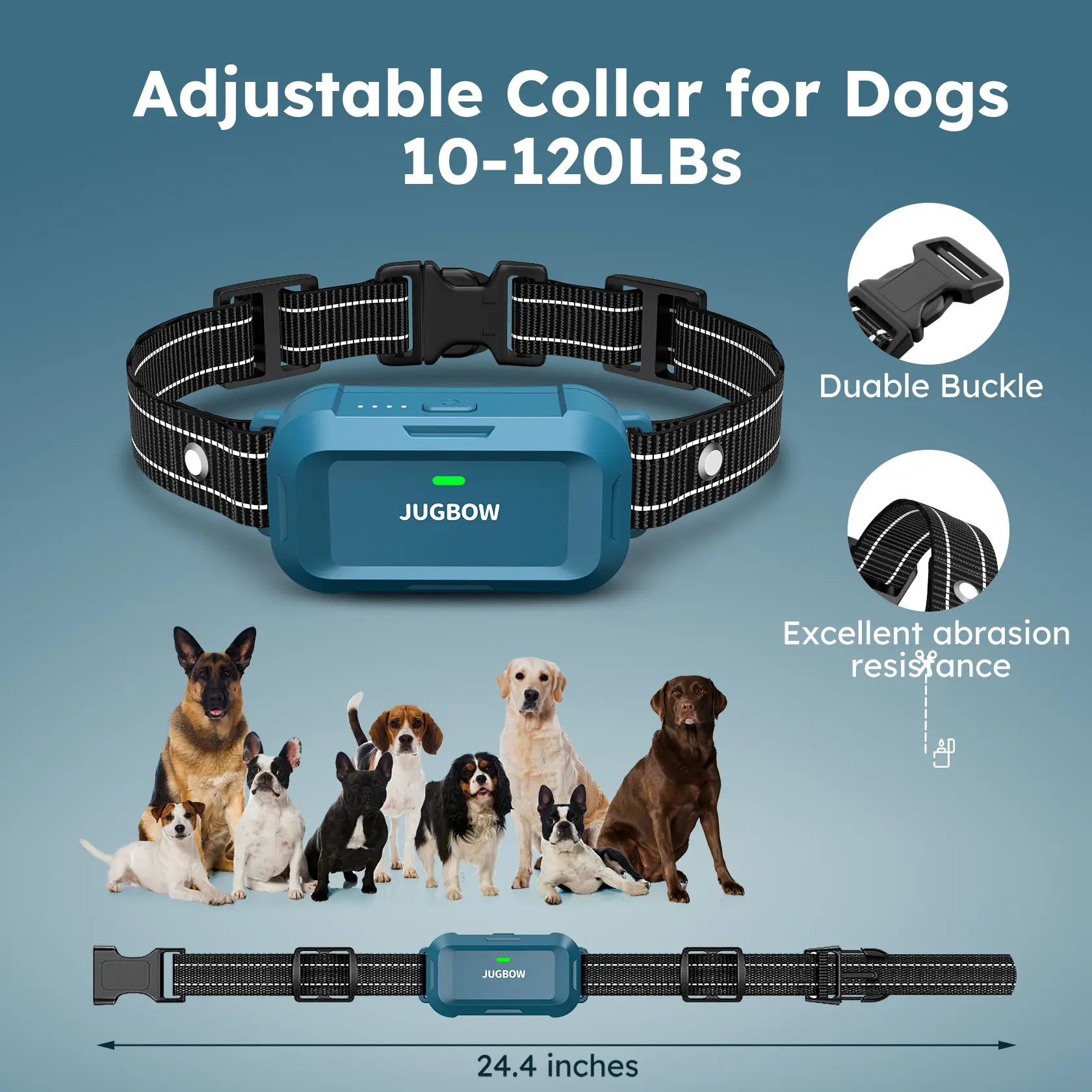 Jugbow training collar for dogs sizes long 24.4 inches and weights from 10 - 120 lbs. Dog training collars are suitable for large dogs, medium dogs, and small dogs. Upgraded two-way adjustment strap to accommodate smaller size dogs.