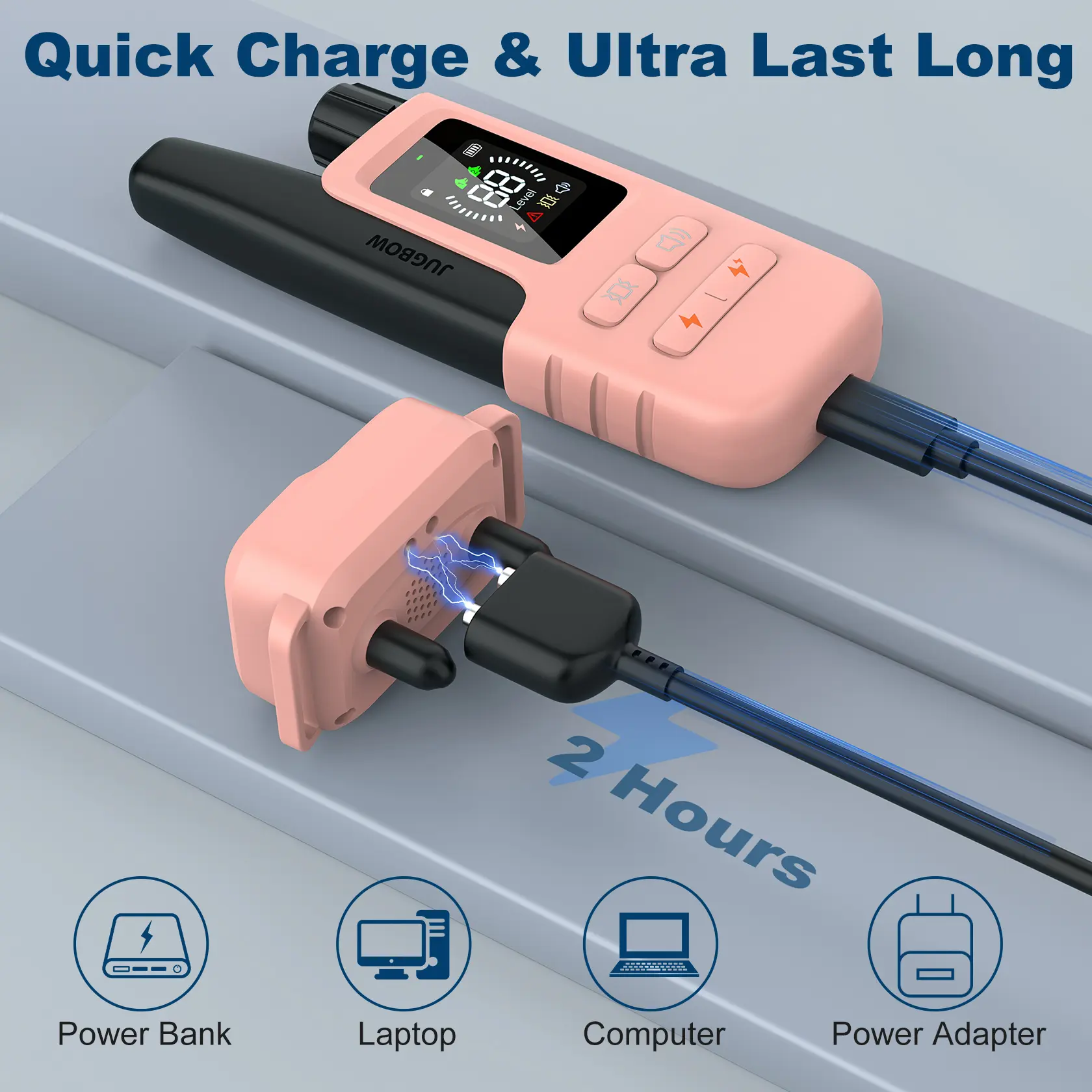Charging via USB, 2-in-1 fast charging only 2 hours to be fully charged. This dog training collar with remote provides battery life that lasts for a long time, the e collar can last up to 35 days of standby time and the remote 45 days!