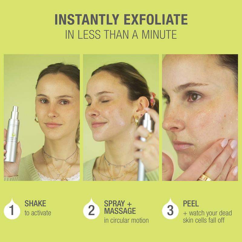 Use the Exfoliating Peel Spray in your morning shower. Hold the bottle a few inches from face (go section by section, forehead, right side of face, left side of face), then your neck, décolleté and finally the tops of each hand. After you spray each section, allow the product to absorb for a few seconds and then using your fingertips, rub the product in using a circular motion and you should feel old skin cells melting off! Then move on to the next section and repeat until you finish. The shower makes it easy because when you are done, rinse everything off with warm water. Avoid contact with eye area.