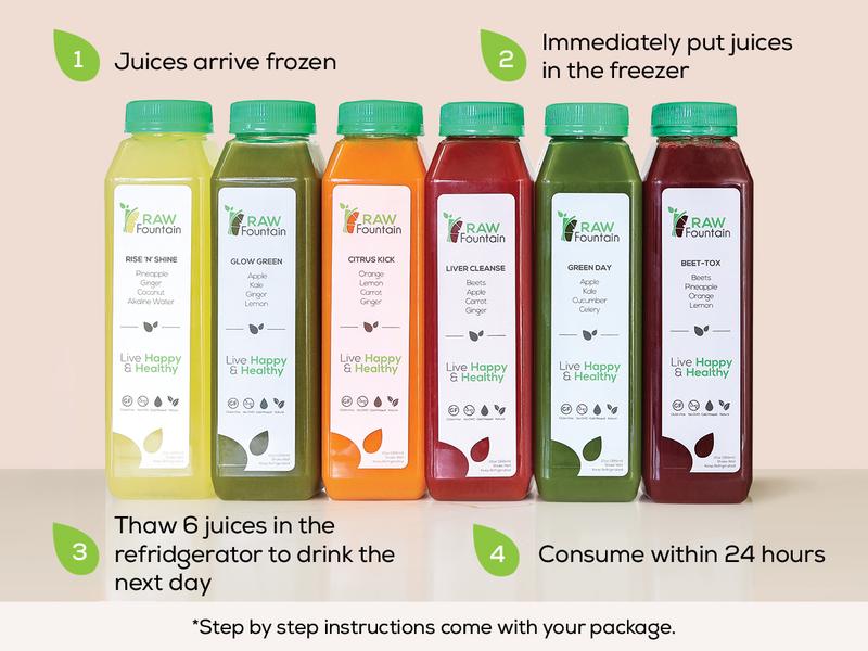 ·HOW DO I GET THEM? The Juices are sent frozen in insulated packaging so that you receive them cold. Thaw 2 days at a time (12 Bottles) or simply put them in the freezer and start your cleanse whenever. Once thawed, the juices MUST to be consumed within 3-4 Days!