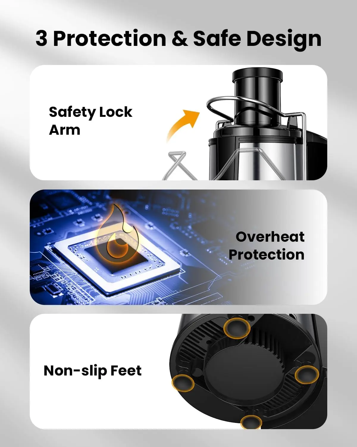 ·【Safety and Overheat Protection Design】- The safety lock arm prevents the centrifugal juicer from operating when the lid isn't securely locked, ensuring user safety. Additionally, the automatic shutdown feature due to overheating protects both the vegetable juicer and users from potential hazards, enhancing overall safety and peace of mind