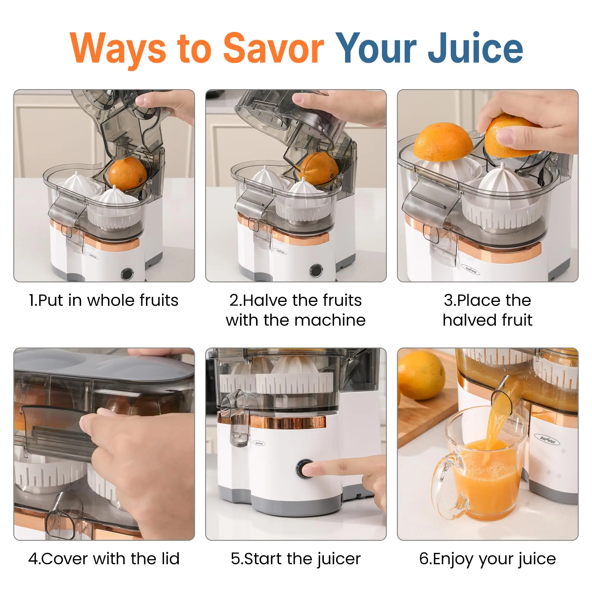 Dual Heads, Double the Juice: With its innovative double-headed design, this juicer lets you juice 2 fruit halves simultaneously, boosting efficiency and saving time. Whether you prefer a quick, single-fruit juice or want to blend 2 different fruits, this versatile juicer delivers. Enjoy a delightful, refreshing juice experience every time.