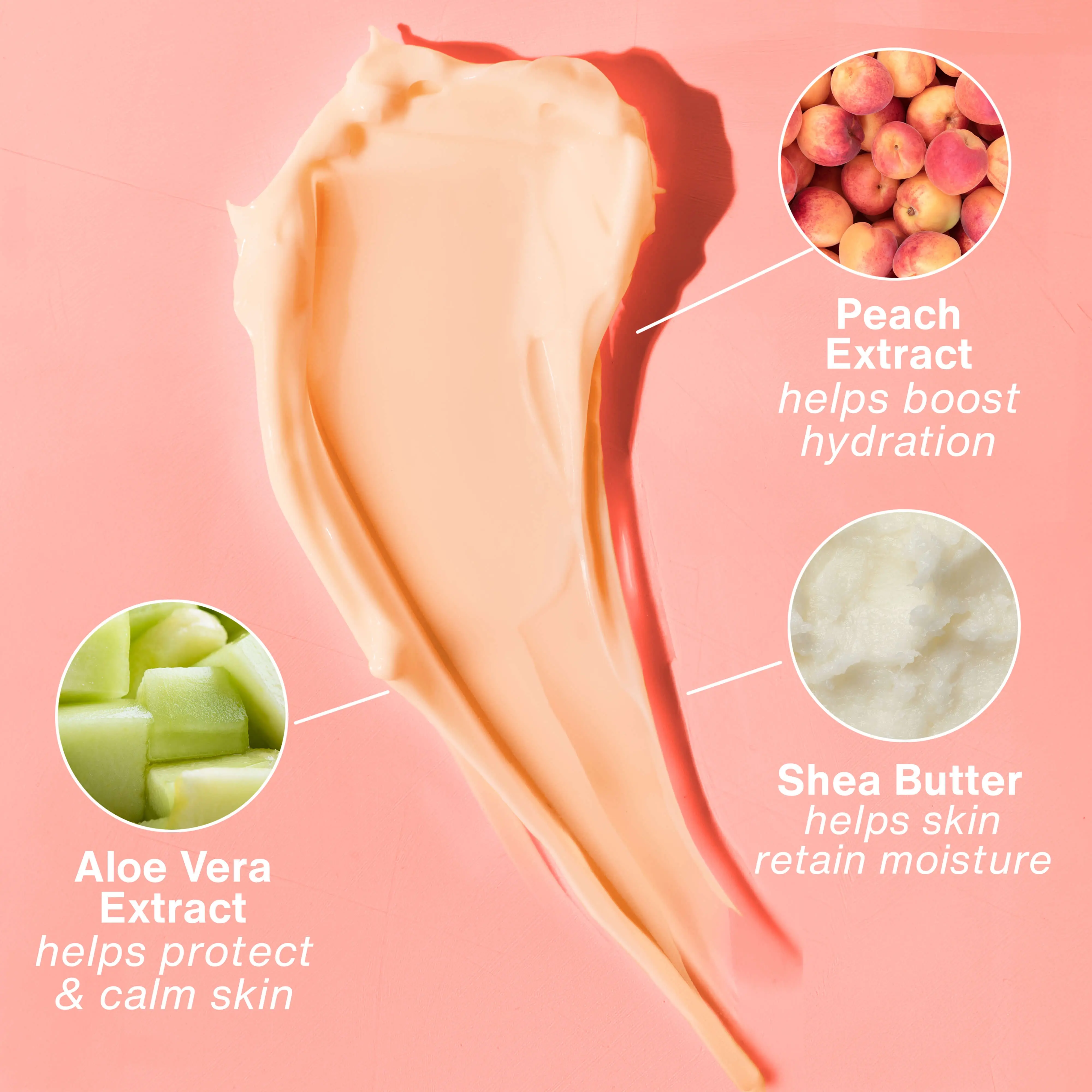 | Ingredients | Water/Aqua/Eau, Isopropyl Palmitate, Butylene Glycol, Propanediol, Fragrance (Parfum), Glycerin, Butyrospermum Parkii (Shea) Butter, Dimethicone, Sorbitan Stearate, Stearic Acid, Glyceryl Stearate, PEG-100 Stearate, Cannabis Sativa Seed Oil, Prunus Persica (Peach) Fruit Extract, Helianthus Annuus (Sunflower) Seed Oil, Tocopheryl Acetate, Aloe Barbadensis Leaf Juice, Phenoxyethanol, Cetyl Alcohol, Polysorbate 40, Limonene, Nylon-12, Carbomer, Chlorphenesin, Ethylhexylglycerin, Aminomethyl Propanol, Hexyl Cinnamal, Trisodium Ethylenediamine Disuccinate, Benzyl Benzoate, Citral, Pinene, Linalool, Yellow 6 (CI 15985), Rose Ketones, Citronellol, Red 40 (CI 16035), Ascorbic Acid, Green 3 (CI 42053), Panthenol, Citric Acid, Potassium Sorbate, Sodium Benzoate |
