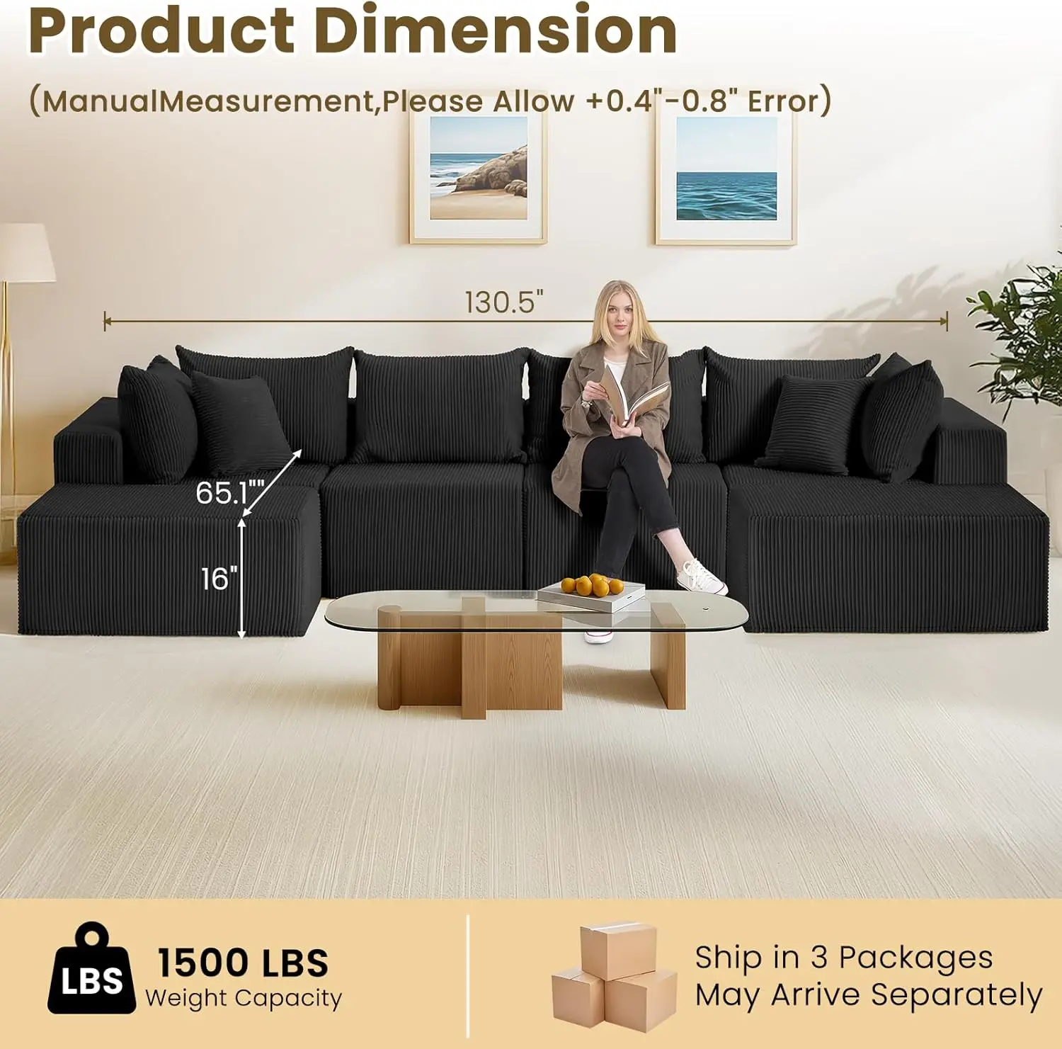 I love my new sofa! It’s really great material and feels good. It comes in those two boxes! Be careful when cutting the plastic! All of these pillows! I’m so happy and it didn’t take long to be delivered at all! You’ll love it too!