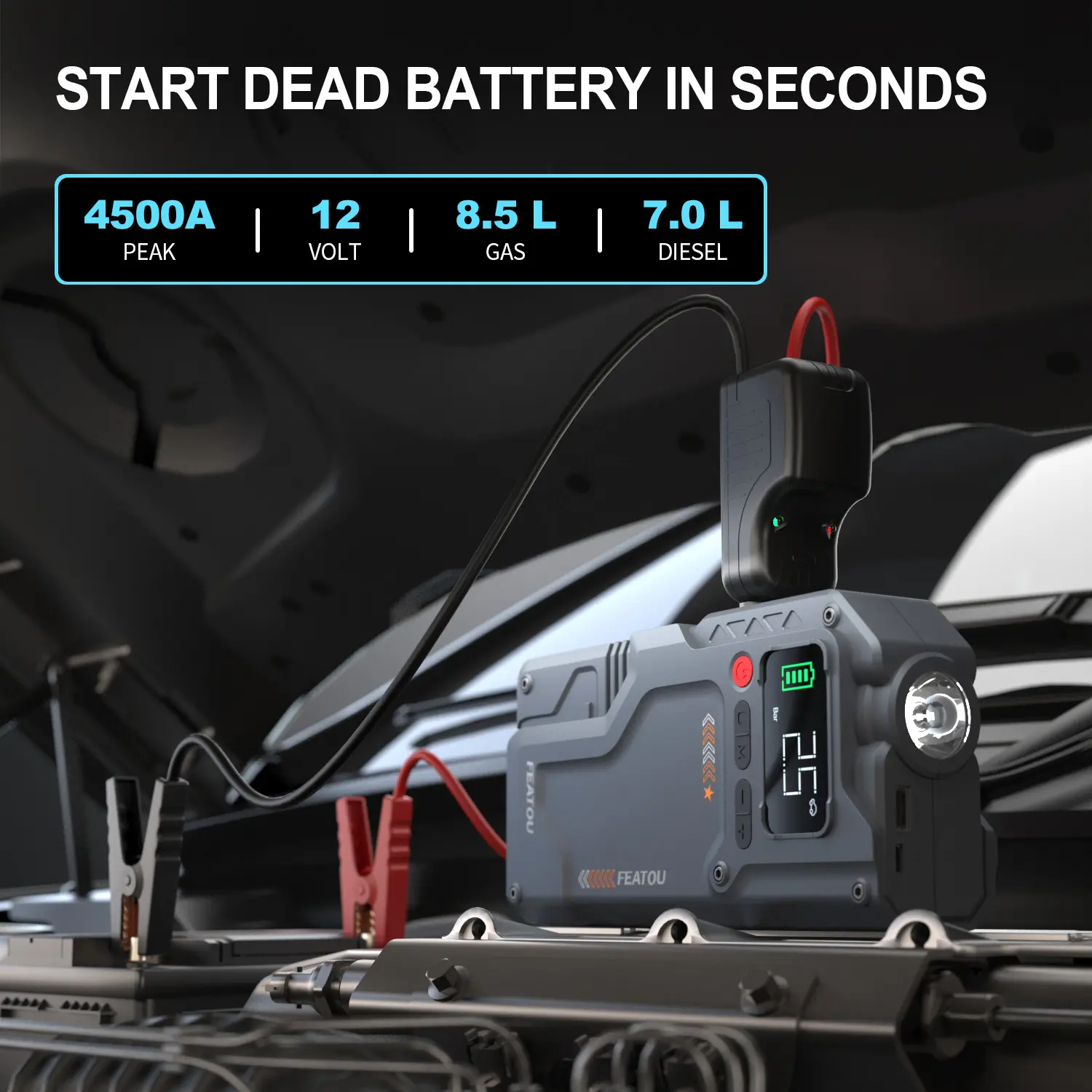 ·5 in 1 Feature: Multifunctional car jump starter that collection of jump starter, fast charging power bank, inflation pump, LED lighting and tire pressure monitoring. The portable jump pack is a comprehensive roadside emergency car kit provided for you