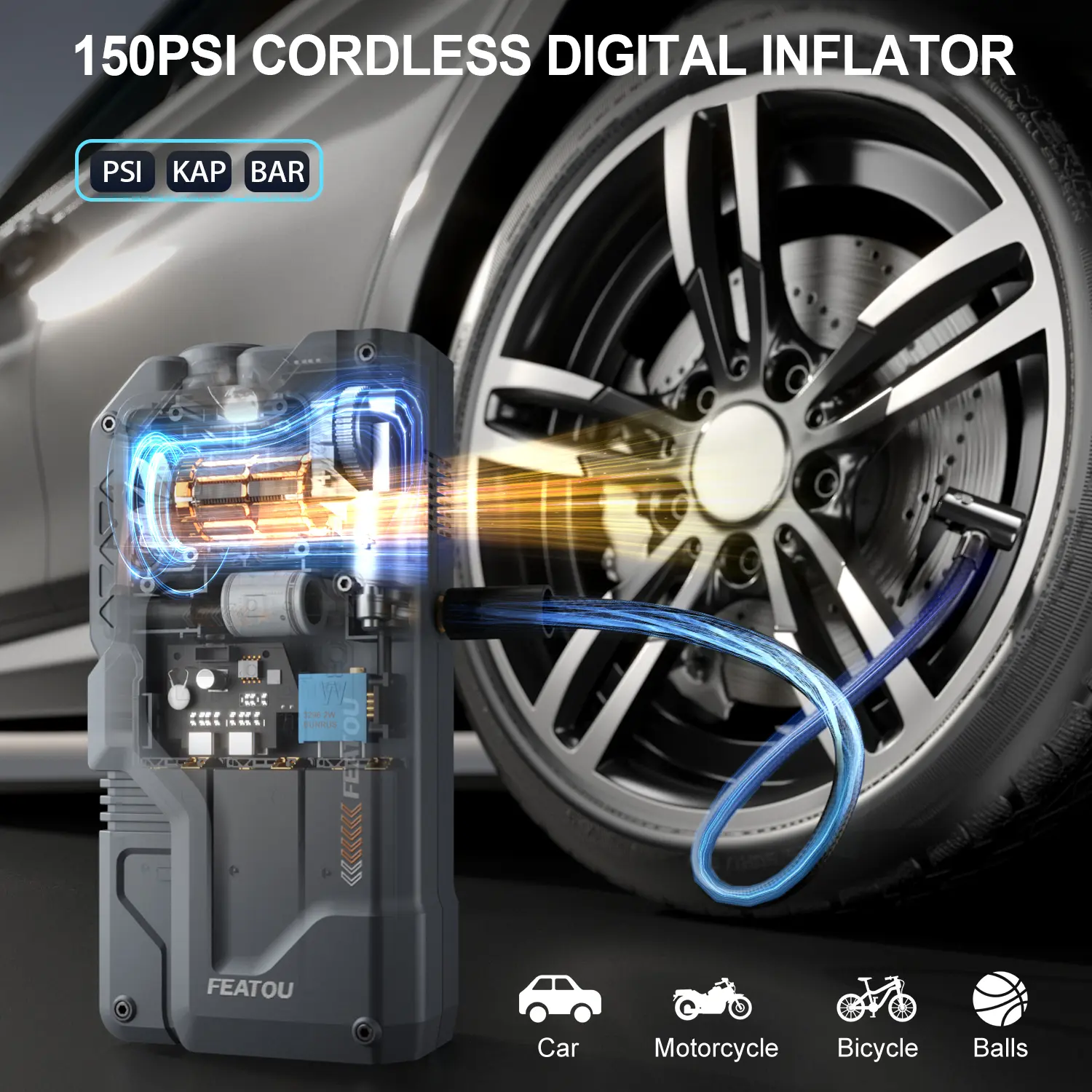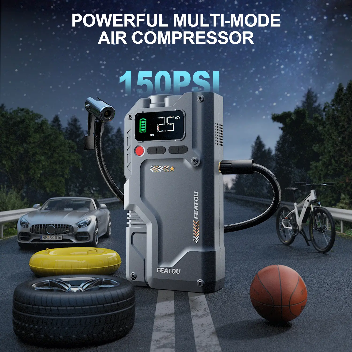 ·Up to 150 PSI Smart Tire Inflator: The LED screen sets recommended air pressure values in different scenarios, including common cars, motorcycles, bicycles, basketballs, etc. Of course, you can also adjust the value according to your needs to accommodate more products that need to be inflated. The maximum pressure value of the product can reach 150 PSI, which can meet most needs in life scenarios