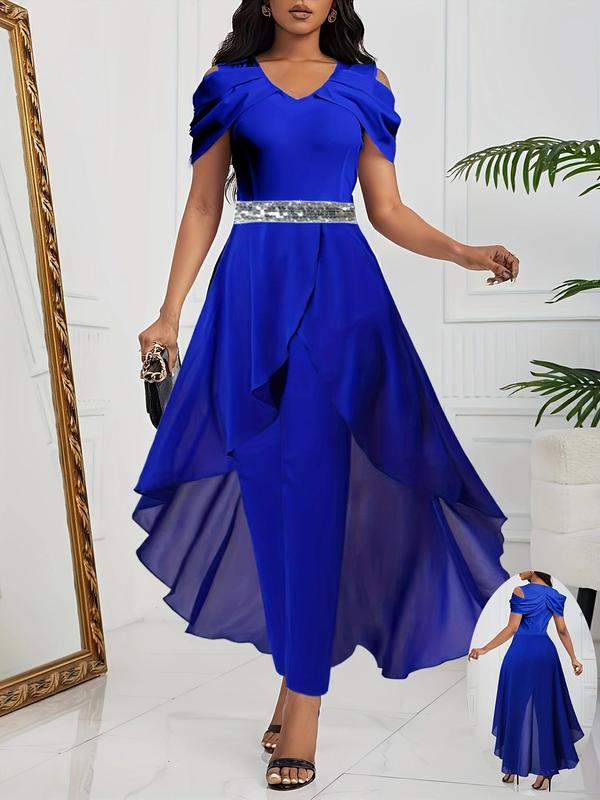 【Contrasting Sequins】: The jumpsuit features eye-catching contrast sequin accents, elevating its appeal for formal gatherings or parties.