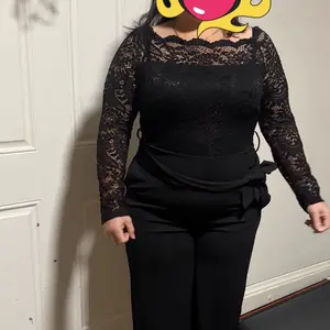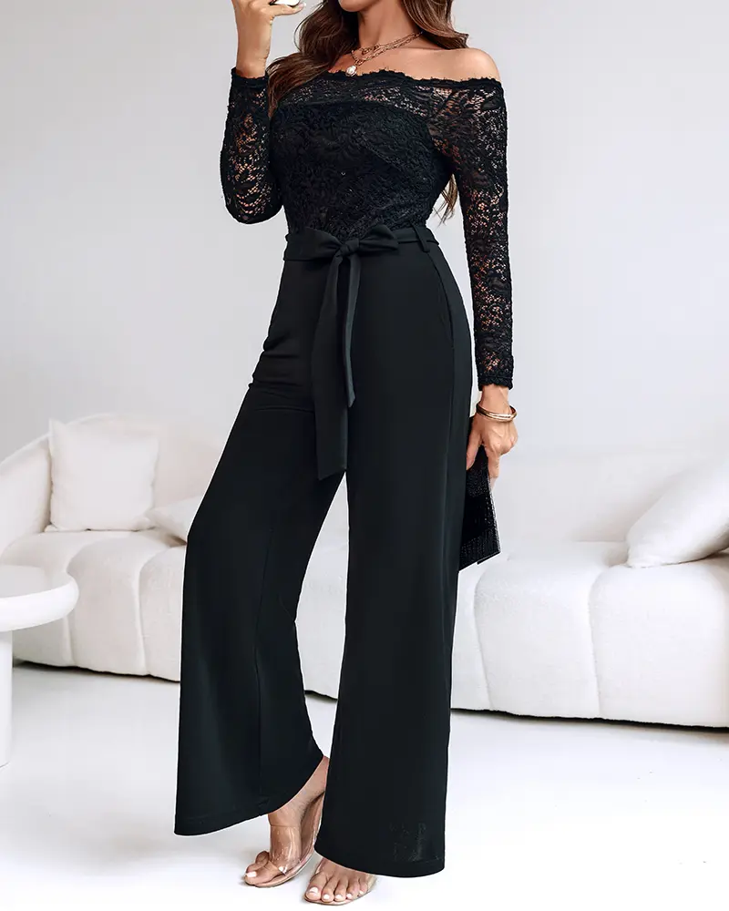 ChicMe Women's Off Shoulder Long Sleeve Eyelash Lace Patch Slim Fit Jumpsuit/Elegant Off-Shoulder Lace Overalls Tied Detail Wedding Guest Casual Overalls Elegant Black Fitted Wedding Piece
