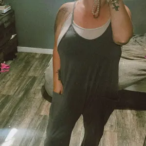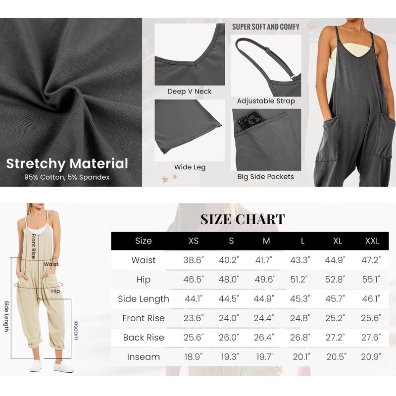 ·Design details:Adjustable shoulder straps, deep v neckline, low crotch design, wide leg design with two large side pockets.