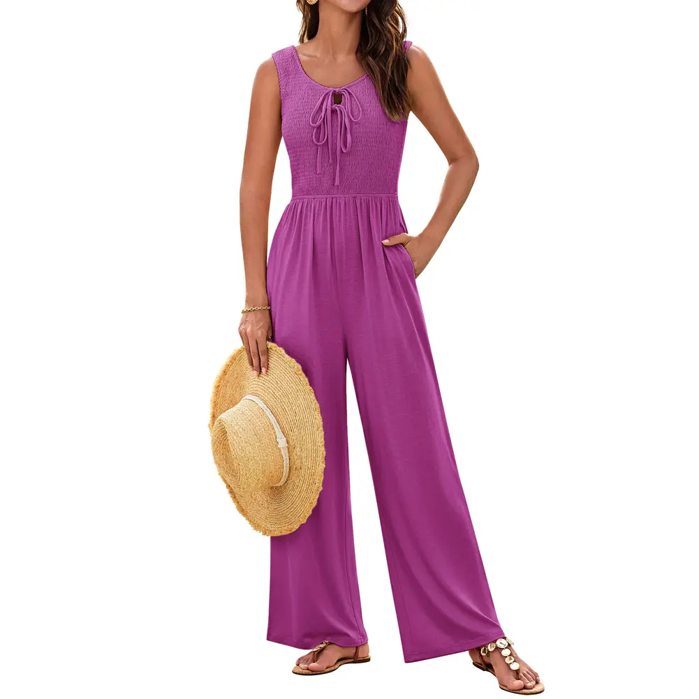 GRACE KARIN Jumpsuits for Women Bow Tie Front Overalls Smocked Tops Wide Legs Casual Knitted Outfits with Pockets