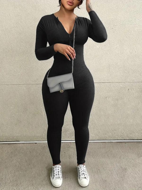 Women's Solid Color Zip Up Jumpsuit, Casual Comfy Long Sleeve Jumpsuit for Daily Wear, Ladies Spring & Fall Clothes #womens2piecesets #plussizesweatsuit #sweatsuitset #flatteringtwopieceset #longsleevebodysuit #womensoutfits #jumpsuitset #thermaljumpsuit #sportyjumpsuit #backlessjumpsuit