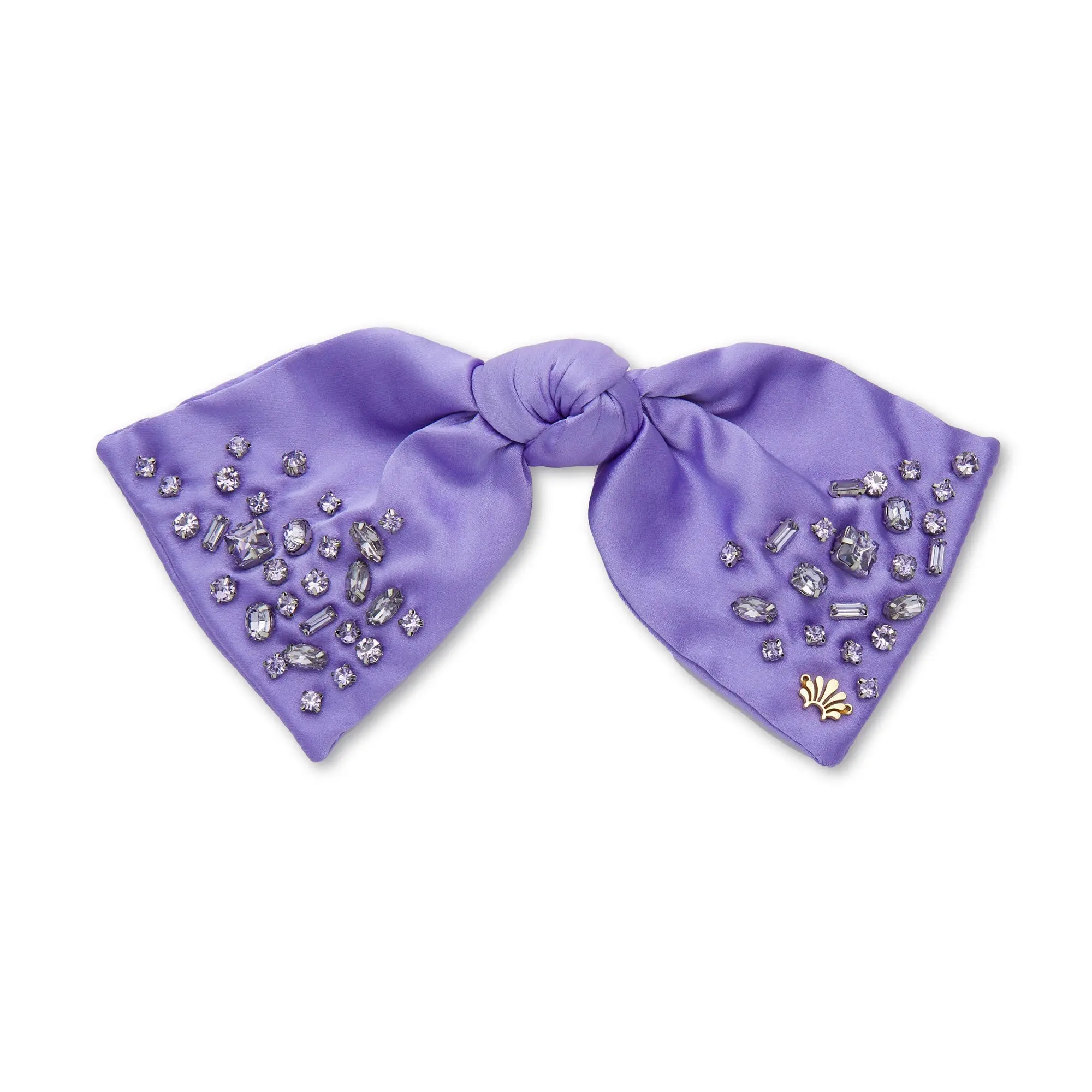 ∙ Lavender poly-silk blend ∙ Hand-embellished with round, oval, square, navette and baguette alexandrite crystals ∙ Antique silver plated prong settings ∙ Measures 7" by 3" ∙ Non-slip barrette closure ∙ Trademark logo charm ∙ Spot clean, store in our custom birthstone pouch