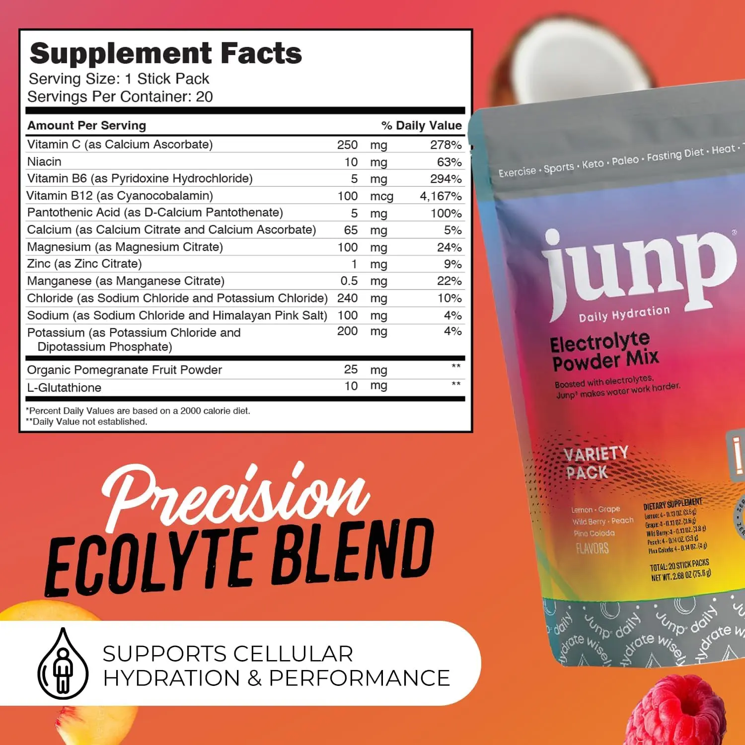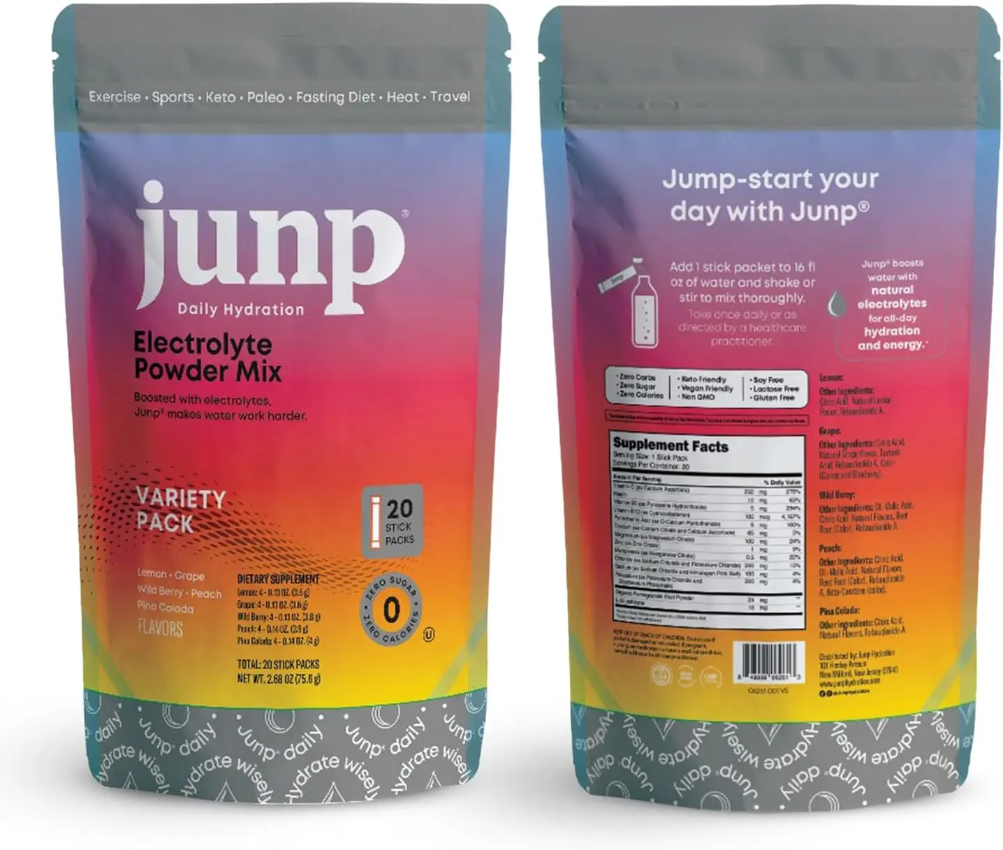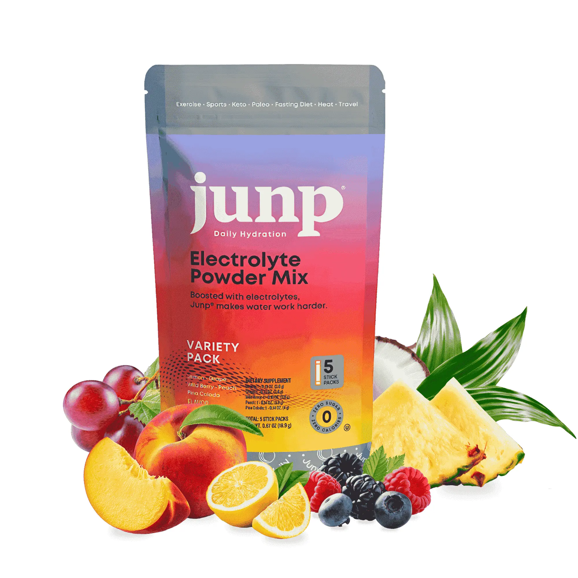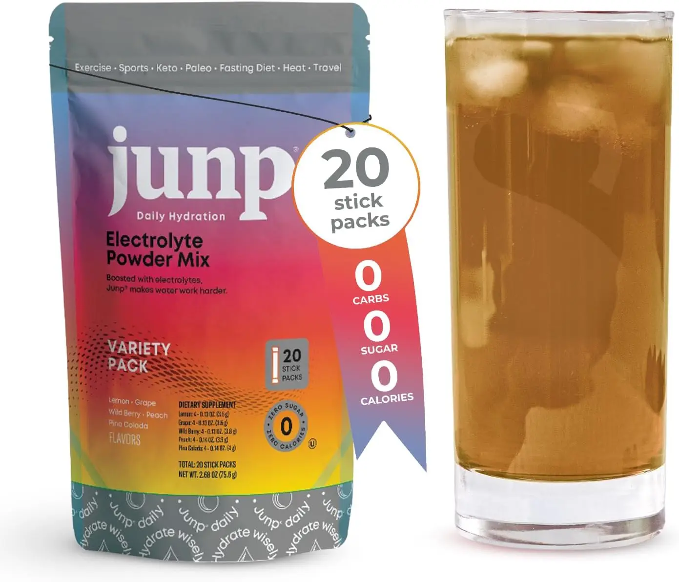 Junp Hydration Electrolyte Stick Packs provide single-serve hydration. Transform your water into a powerful drink with zero sugar, calories, or carbs. Just tear, pour, and sip to replenish essential electrolytes anytime, anywhere. Perfect for workouts, travel, or daily use.