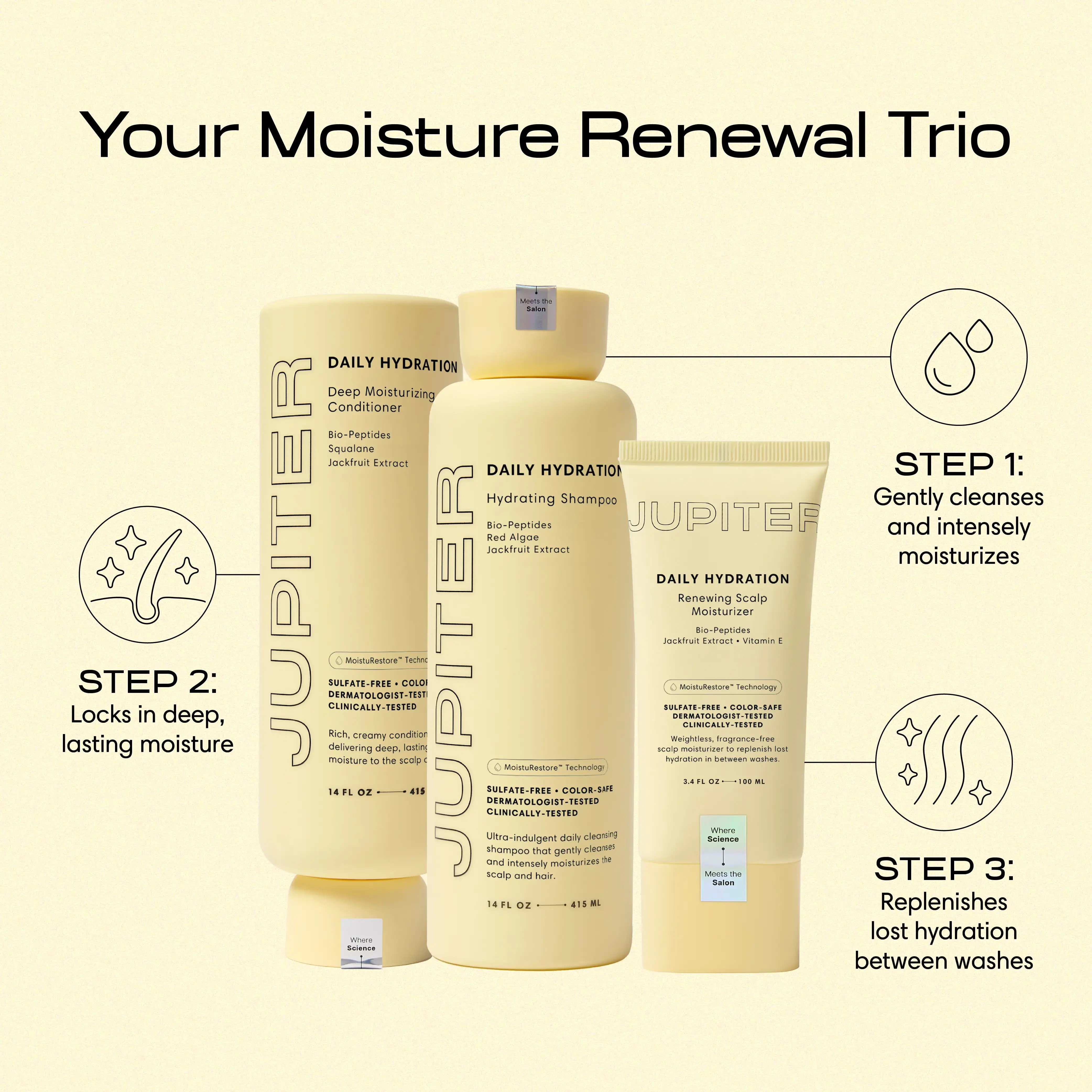 Revitalize from root to tip with the Moisture Renewal Trio. Powered by MoistuRestore Technology, our Hydrating Shampoo, Deep Moisturizing Conditioner, and Renewing Scalp Moisturizer (fragrance-free) restore moisture to the scalp barrier while leaving strands soft, shiny, and beautifully refreshed.