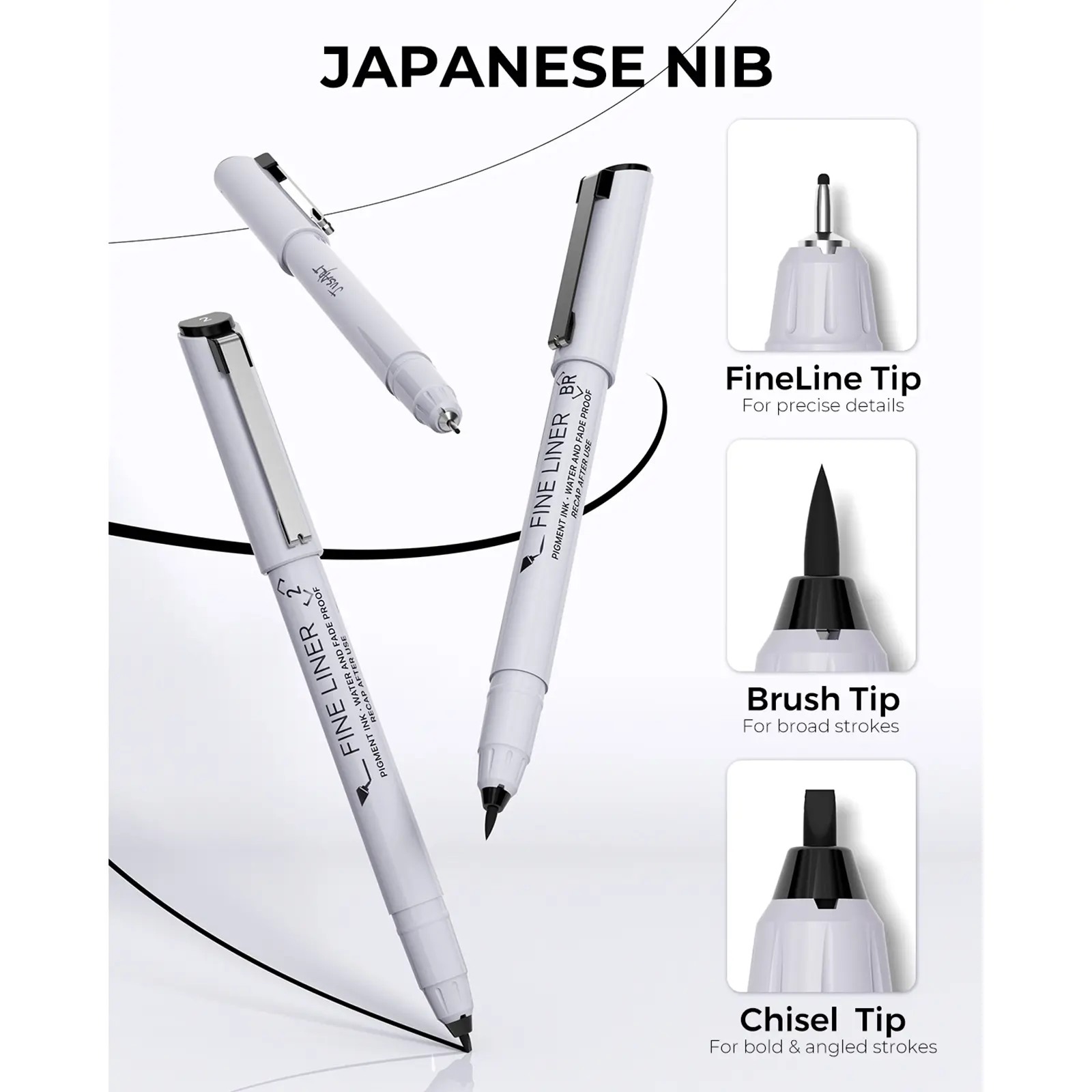 ·ULTRA-FINE, FINE, BRUSH, CHISEL 12-SIZE POINT TIPS: JustArt fineliner pen set includes 12 tip sizes: 0.2mm (005), 0.25mm (01), 0.30mm (02), 0.35mm (03), 0.40mm (04), 0.45mm (05), 0.5mm (07), Brush (BR), and Chisel Tip—1.0mm (10), 2.0mm(2), 3.5mm(3.5) allowing you to create everything from delicate, fine lines to bold, expressive strokes. Perfect for detailed illustrations, sketches, journaling, and a wide range of creative projects