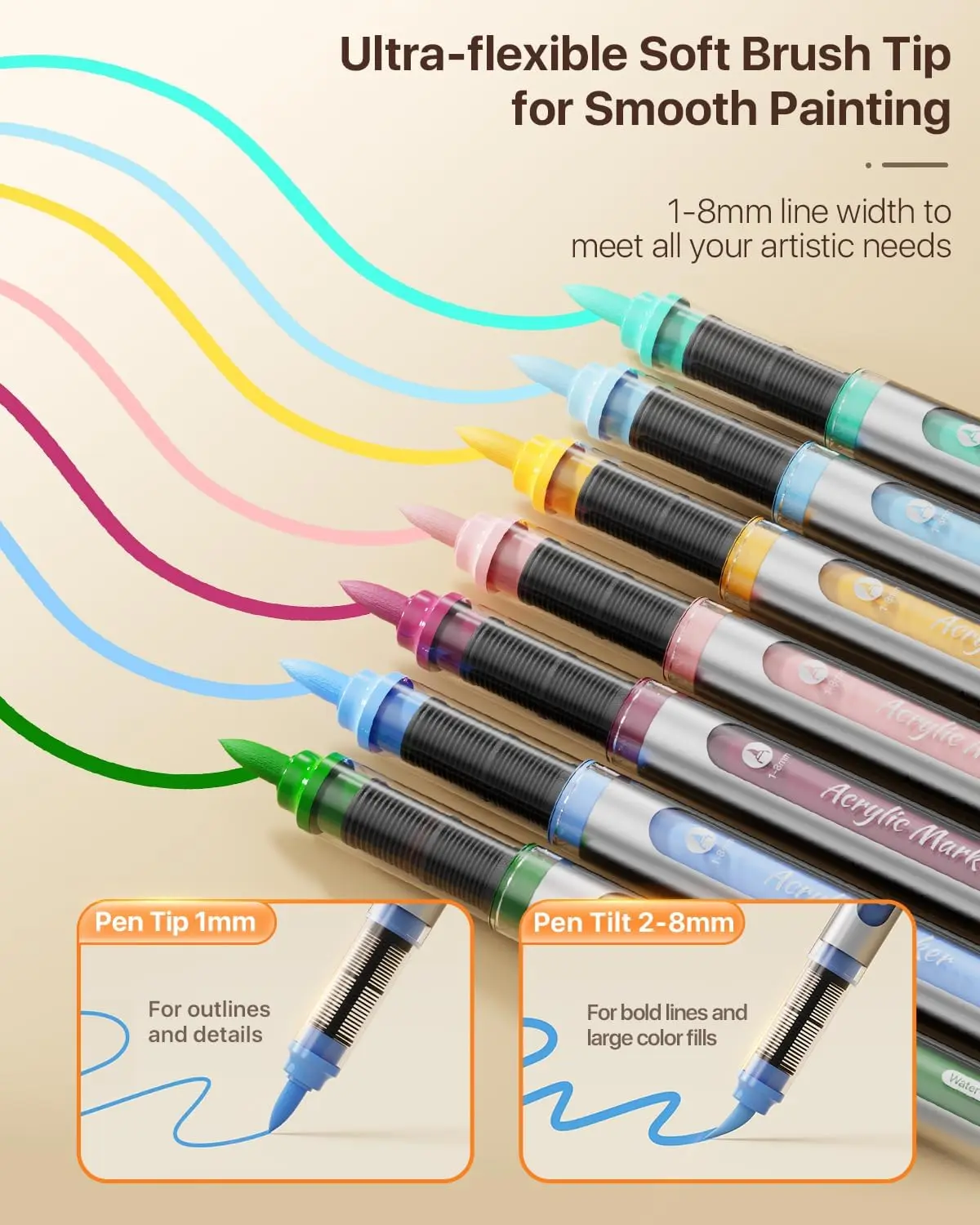 ·Flexible Brush Tip Markers for Direct Use: The soft brush tip design allows ink to flow without pressing, enabling you to create 1-8mm lines by adjusting the angle. Whether outlining or filling large areas, this paint marker does it all.