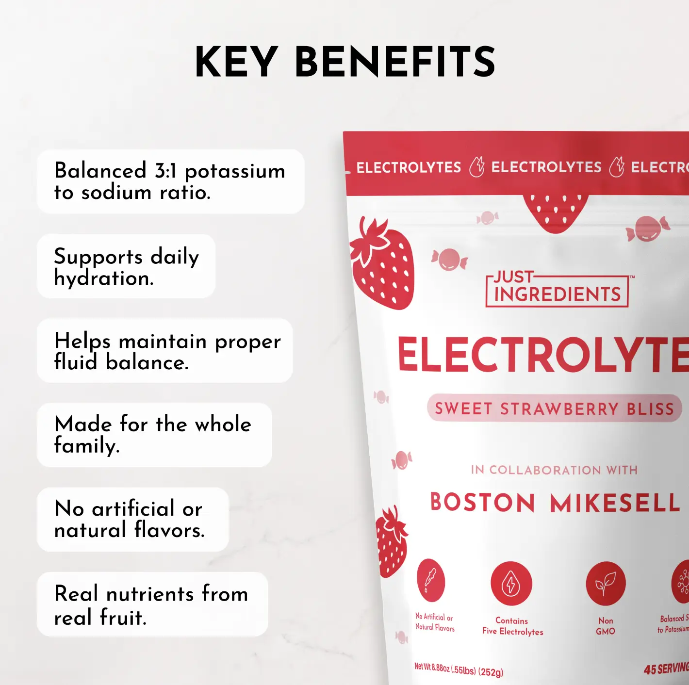 Just Ingredients Boston's Sweet Strawberry Bliss Electrolytes Drink Mix | 45 Servings | Organic Coconut Water & 5 Key Electrolytes | Supports Hydration, Electrolyte Balance & Muscle Recovery* | No Sugar Added
