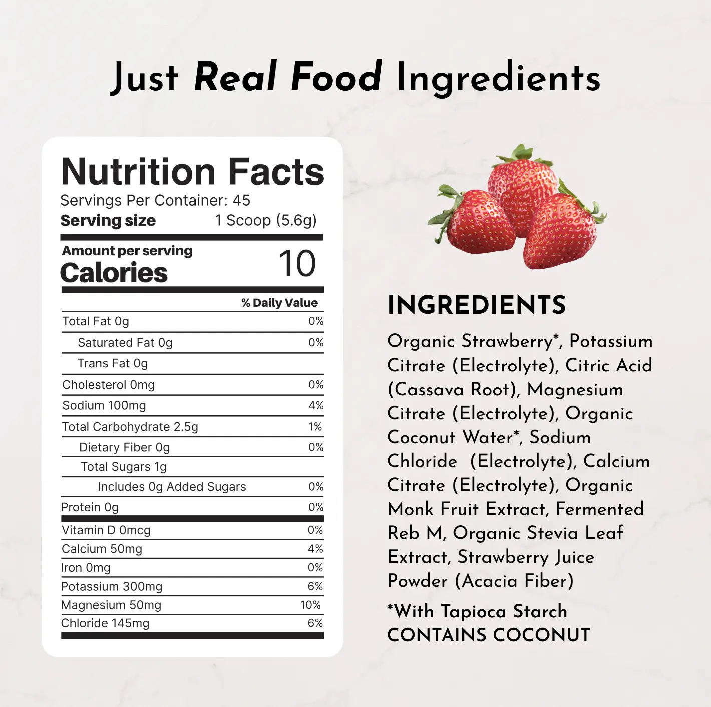IngredientsOrganic Strawberry*,Potassium Citrate (Electrolyte),Citric Acid (Cassava Root),Magnesium Citrate (Electrolyte),Organic Coconut Water*,Sodium Chloride (Electrolyte),Calcium Citrate (Electrolyte),Organic Monk Fruit Extract,Fermented Reb M,Organic Stevia Leaf Extract,Strawberry Juice Powder (Acacia Fiber)