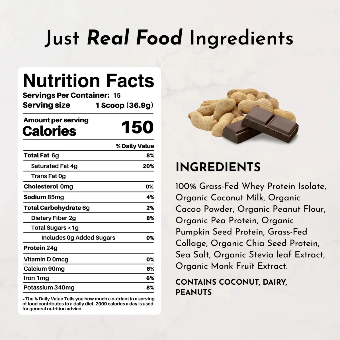 ·Quality ingredients: Made by Just Ingredients, this protein powder is crafted with care using only the highest quality ingredients. It contains 100% grass-fed non-denatured whey protein isolate, coconut milk, cacao, peanut flour, pea protein, pumpkin seed protein and grass-fed collagen.
