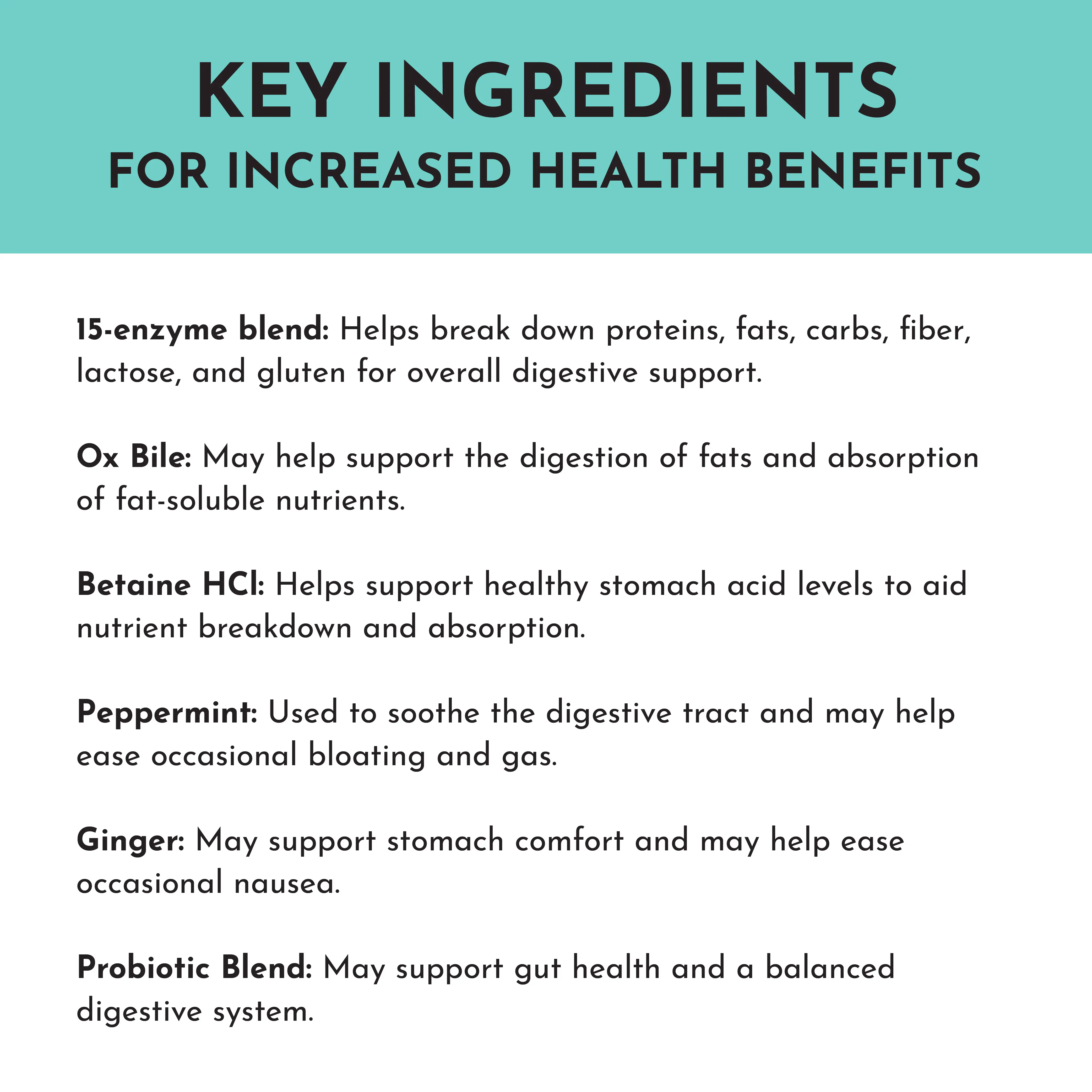 This product is for people who want digestion support. The digestive enzyme may help support healthy digestion with our 15-enzyme blend, designed to help break down proteins (including gluten), fats, carbohydrates (including lactose), and fiber. Added ox bile may support fat digestion and the absorption of fat-soluble vitamins, while betaine HCl may help maintain healthy stomach acid levels. Organic ginger and peppermint extracts provide gentle digestive comfort and may help ease occasional nausea, bloating, and gas. Plus, our 3 billion CFU probiotic blend may help support a balanced gut microbiome for overall digestive wellness.