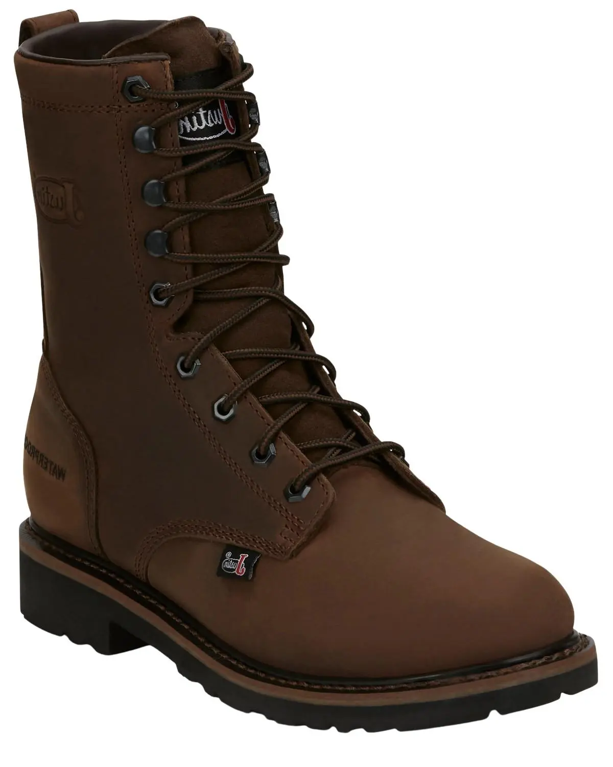 Full-grain leather. 8" lace-up shaft. Soft toe. Mesh lining. Cushioned footbed. Waterproof. Rubber outsole.