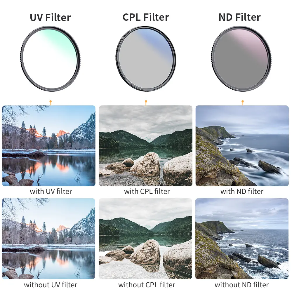·【Craft Your Vision with Precision Filters】The UV filter provides robust lens protection and shields against UV ray distortion. The circular polarizing filter elevates color vibrancy and contrast, banishing glare from non-metallic surfaces like water and glass. The ND4 filter delivers a 2-stop light reduction, ideal for capturing captivating shots even on overcast days.