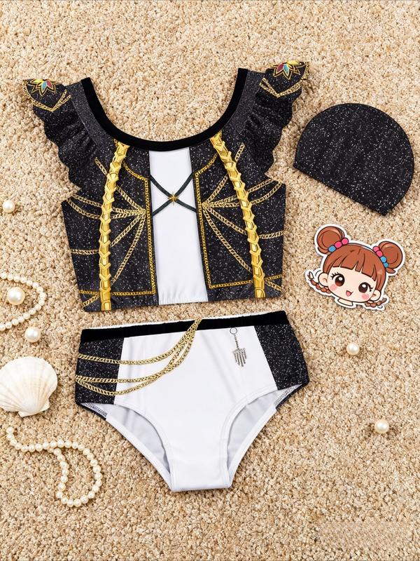 K-Pop Demon Girl Swimwear 3-Piece Set for Girls, Spring Summer Festival Must-Have, Includes Swim Cap, Swimsuit, and Swim Shorts