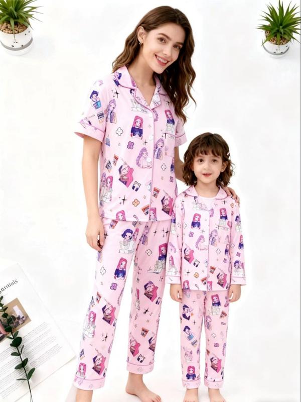 K-Pop Demon Hunter Kids Parent-Child Pajama Set, Cartoon Print Hooded Short Sleeve Top & Elastic Waist Long Pants, Comfortable Home Wear
