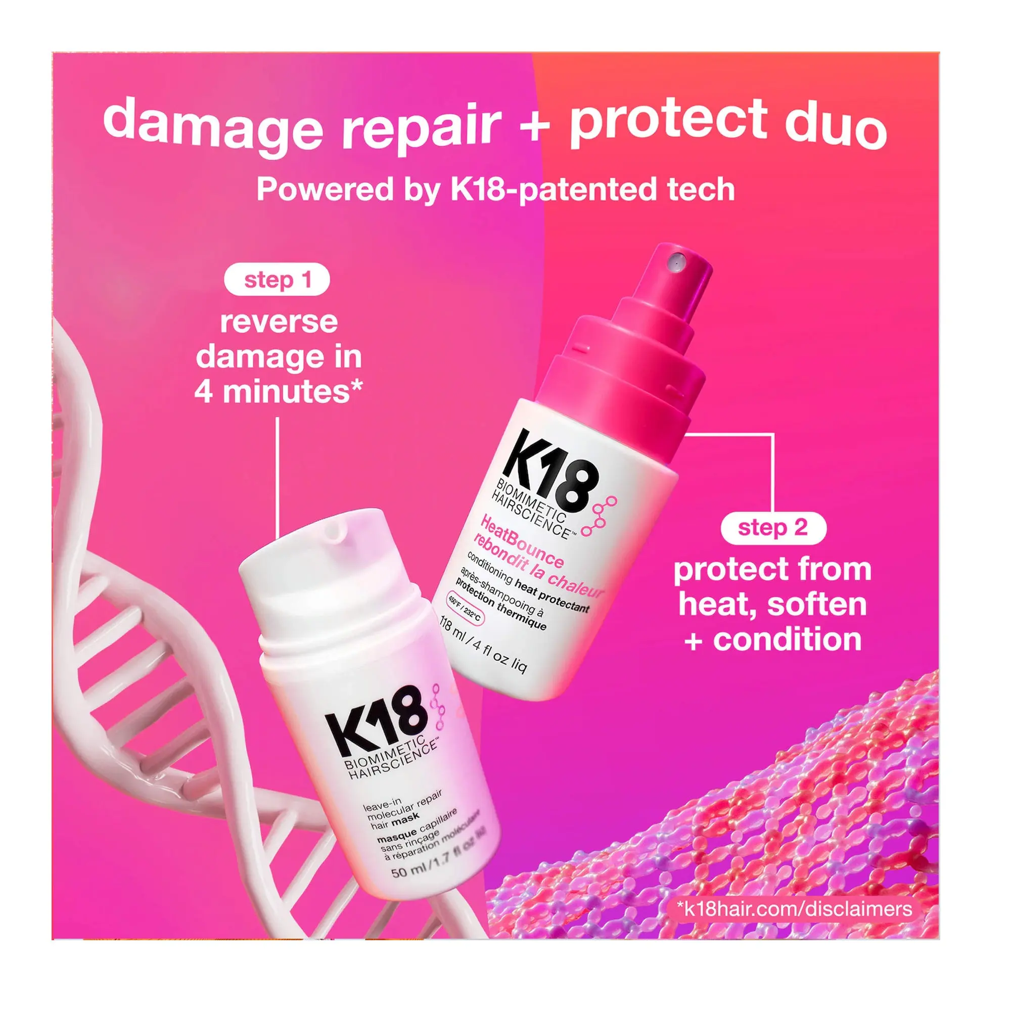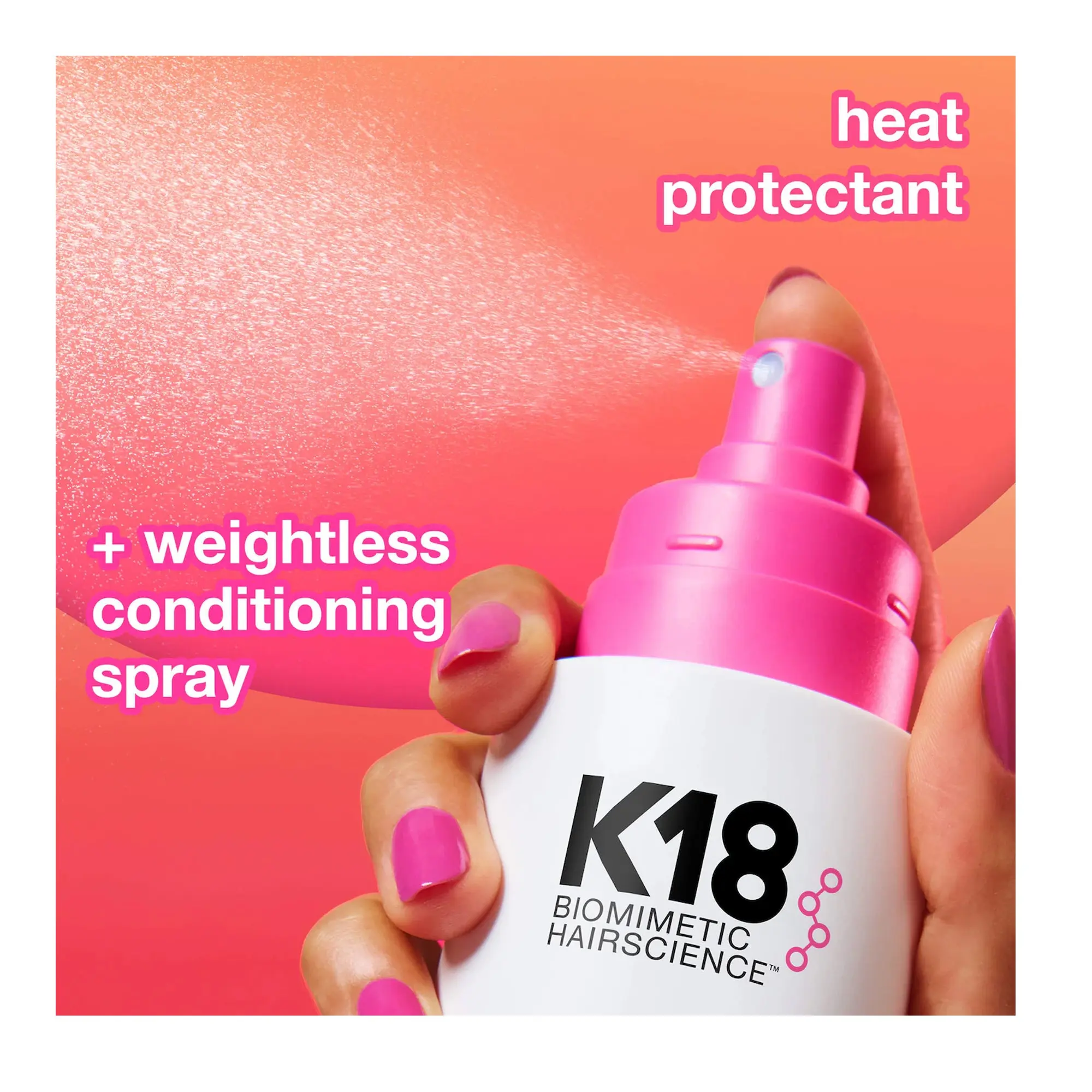 K18 HeatBounce Leave-In Conditioner and Heat Protectant is powered by advanced Resilicore heat-shielding technology to defend hair from the inside out. It protects against heat damage up to 450°F, while conditioning, detangling, and shielding hair from mechanical stress, UV exposure, and environmental factors that contribute to color fading, dryness, and breakage.Inspired by resilin—a natural protein known for its heat resistance—Resilicore is a cutting-edge innovation that goes beyond surface protection. Unlike traditional protectants that sit on the cuticle, Resilicore penetrates deep into the cortex, where heat damage begins, forming a powerful internal shield. Suitable for all hair types and textures, including extensions.