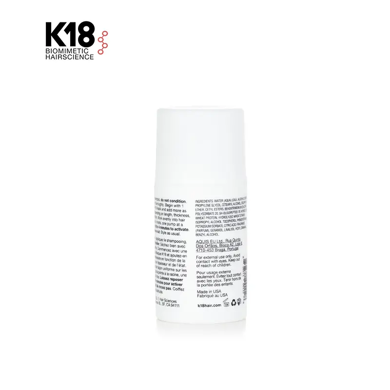 ·K18Peptide TM, Water (Aqua) (Eau), Alcohol Denat., Propylene Glycol, Cetearyl Alcohol, Dicaprylyl Ether, Cetyl Esters, Behentrimonium Chloride, Polysorbate 20, sh-Oligopeptide-78 (K18Peptide), Hydrolyzed Wheat Protein, Hydrolyzed Wheat Starch, Isopropyl Alcohol, Tocopherol, Phenoxyethanol, Potassium Sorbate, Citric Acid, Fragrance (Parfum), Geraniol, Linalool, Hexyl Cinnamal, Benzyl Alcohol.