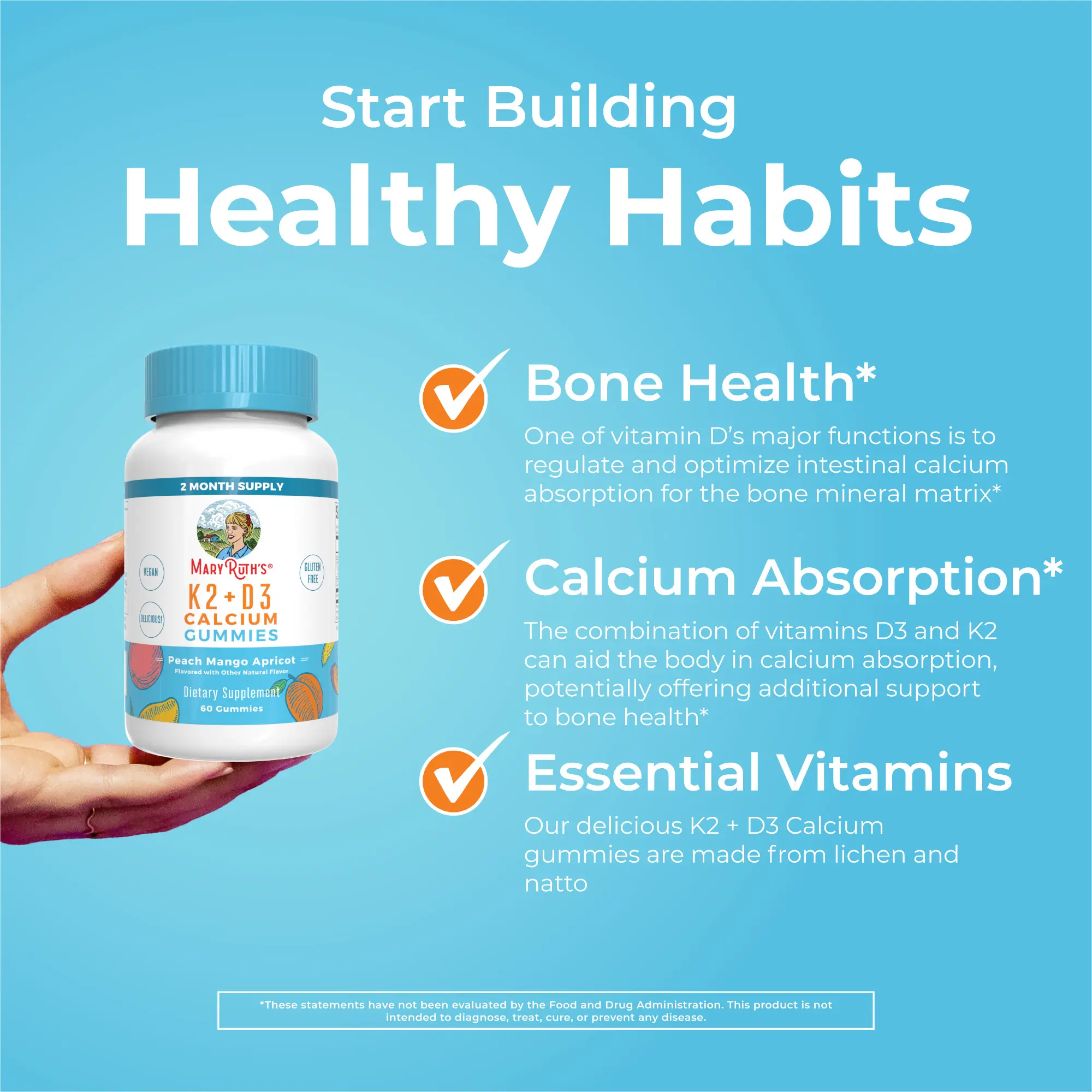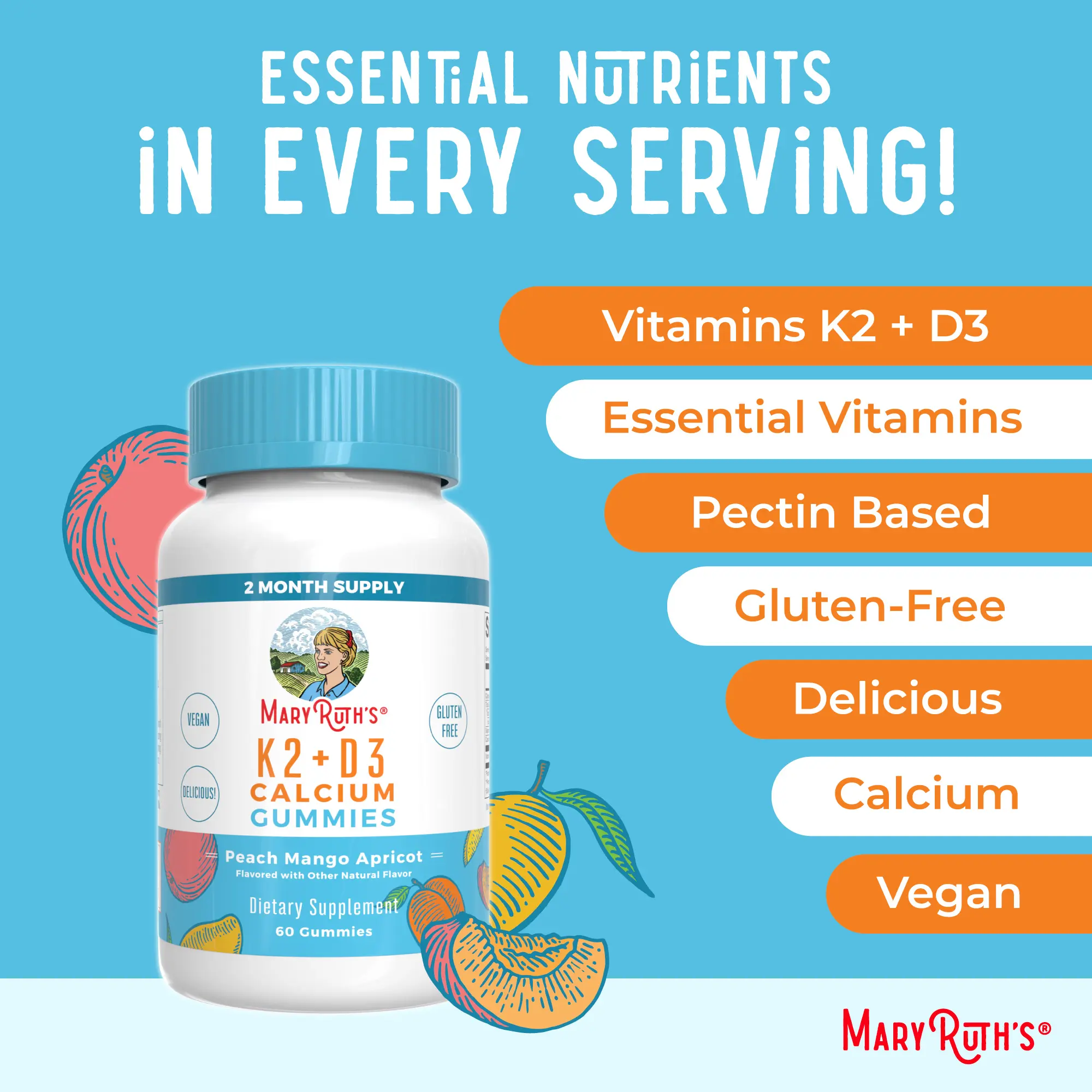 For Most Lifestyles: MaryRuth's K2 + D3 Calcium Gummies are Non-GMO, no gelatin, pectin based, vegan, dade in a GMP (Good Manufacturing Practice) facility. Dairy free, nut free, gluten free, made with organic cane sugar. Kid Friendly. Clean Label Project Verified. B Corp Certified.