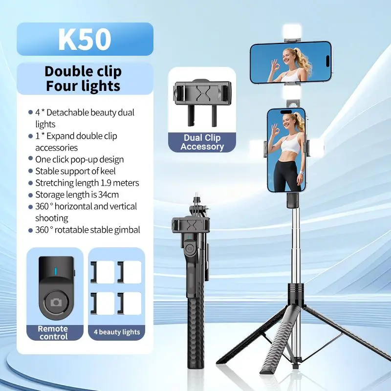 The K50 is a versatile and stable shooting accessory designed for everyday use, offering flexible angle adjustment, anti-shake stabilization, and built-in fill lighting. Its compact design and instant tripod setup make it ideal for various applications, including selfies, short videos, live streaming, and travel.