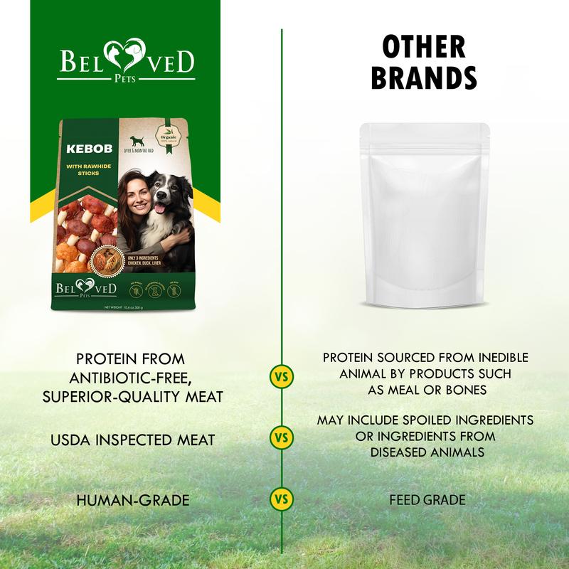 Elevate your dog's snacking experience with our gourmet kebab treats, crafted from human-grade ingredients. These rawhide-free sticks feature duck and chicken liver, perfect for large and small breed dogs, puppies, and aggressive chewers. They offer a dental-friendly chew with every savory bite, making snack time both enjoyable and beneficial for your dog.