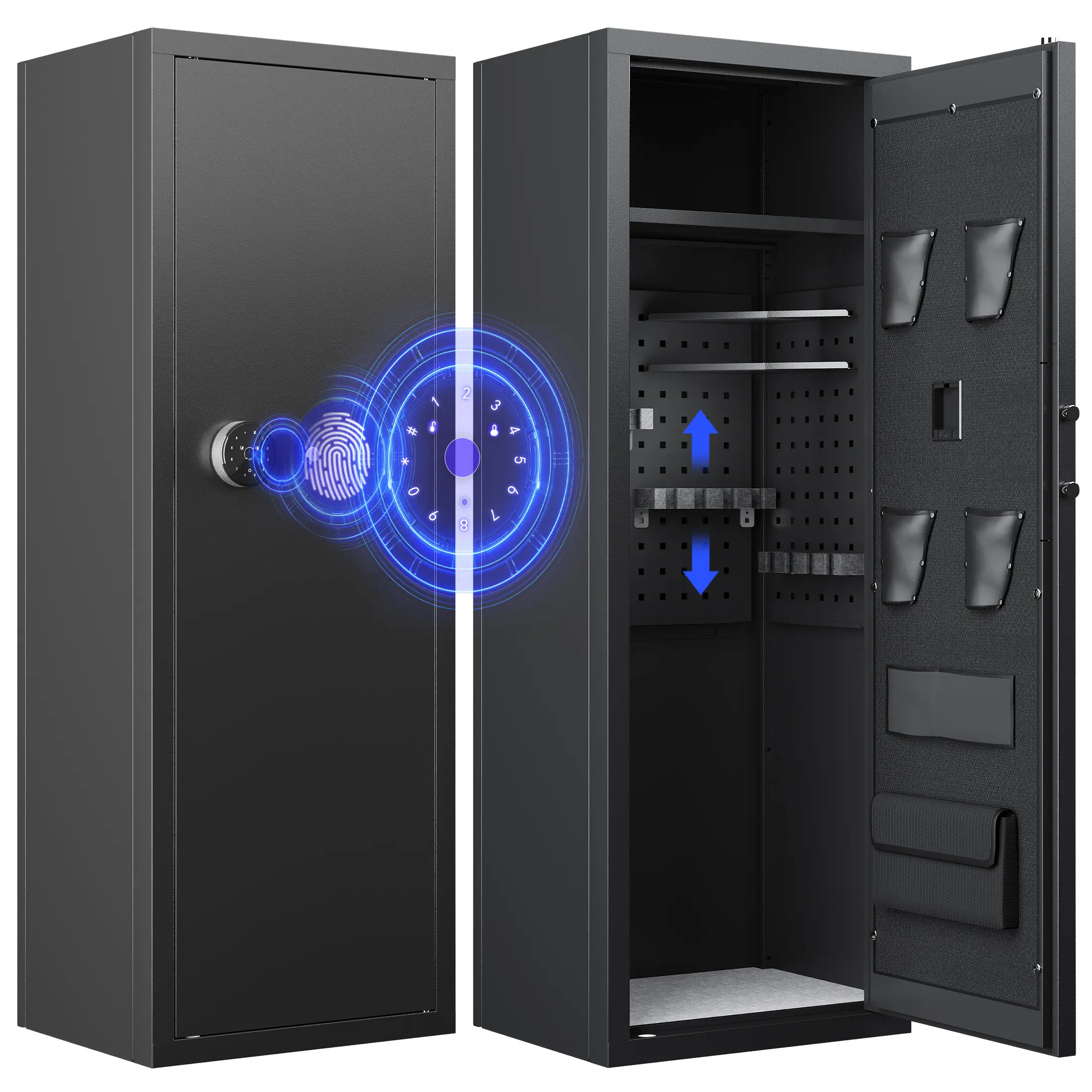 ·3 Ways Quick Access Gun Locker : 1.Fingerprint gun safe get instant access with advanced biometric recognition that unlocks in just 0.1 seconds. 2. Use a customizable digital code. 3. Emergency key. Each method offers security and flexibility tailored to different needs.