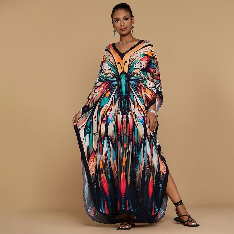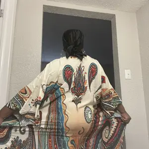This dress is very nice design. It’s kind of made out of thin sheet material.. And I guess it’s not that big as a plus size because it’s not that long on me it goes to like mine calf making the splits seem a little bit higher borderline inappropriate. So I wish they would’ve describe the sizes better. I’m very disappointed. That picture I took was a picture of the side to show you how far the split goes up when you being.! These Momos are like skinny or thick people it shouldn’t have plus sizes. I Did not wear them anywhere, but I did try them on when I got fresh out the shower