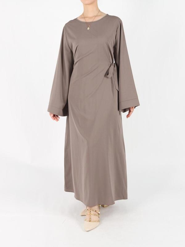 レディース 無地 ベルト付き 長袖 カフタン ドレス、控えめなラウンドネック 長いドレス、デイリーウェアに最適なオールシーズン対応の女性服