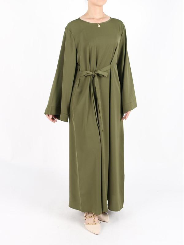 Women's Solid Belted Long Sleeve Kaftan Dress, Modest Round Neck Long Dress for Daily Wear, Casual Ladies Muslim Maxi Clothes for All Seasons, Modesty Muslim Clothing