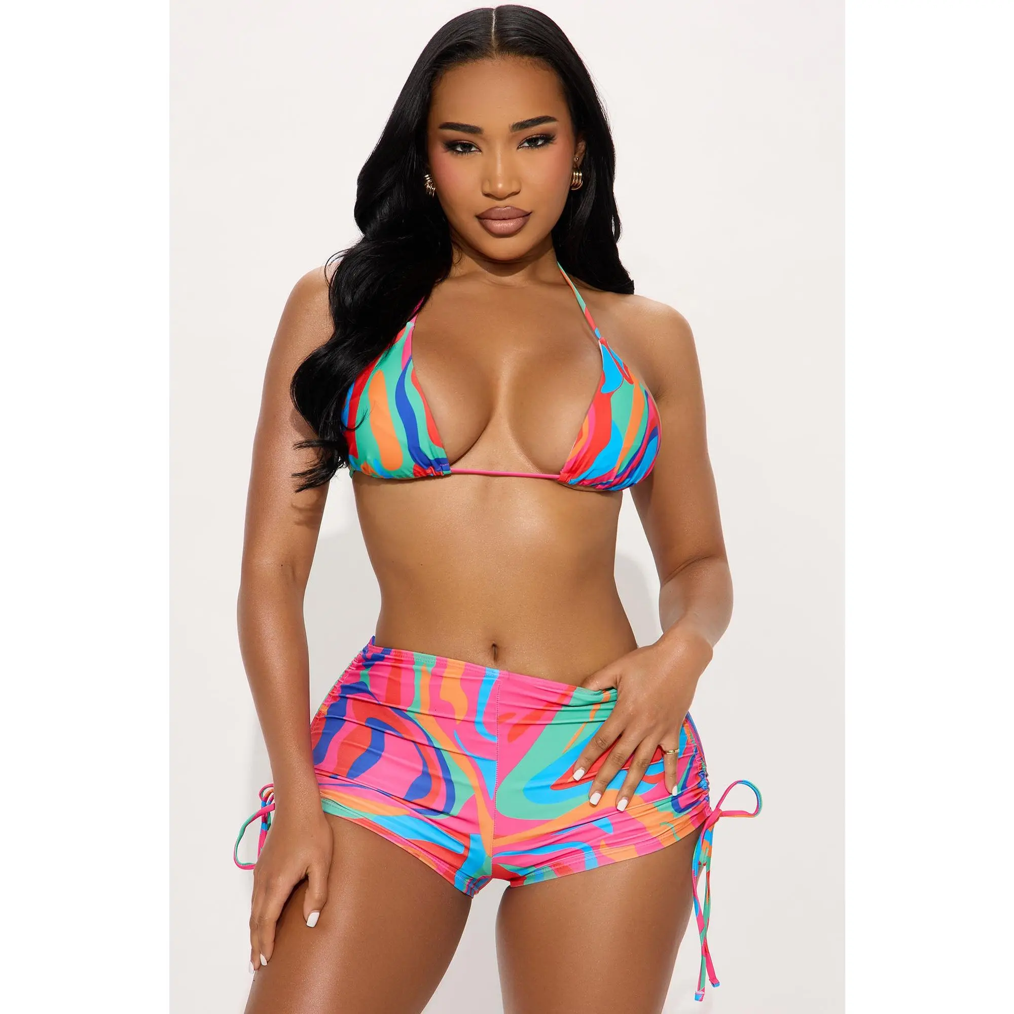 This multicolor three-piece bathing suit is absolutely perfect for summer! ✨ I love the bright vibrant colors & the boy shorts! ✨ For me this bathing suit screams summer!! ✨✨ #swimsuit #bathingsuit #swimwear #summervibe #beachwear
