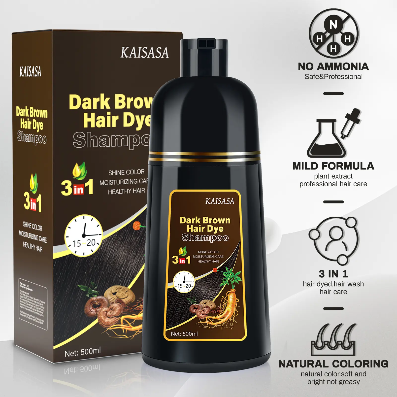 Polygonum multiflorum strengthens hair roots, making them robust and soft. Ginseng extract nourish hair, ensuring long-lasting color without damage. This natural formula balances beauty and health, restoring youthful hair with added shine. It complements gray hair, enhancing its health.