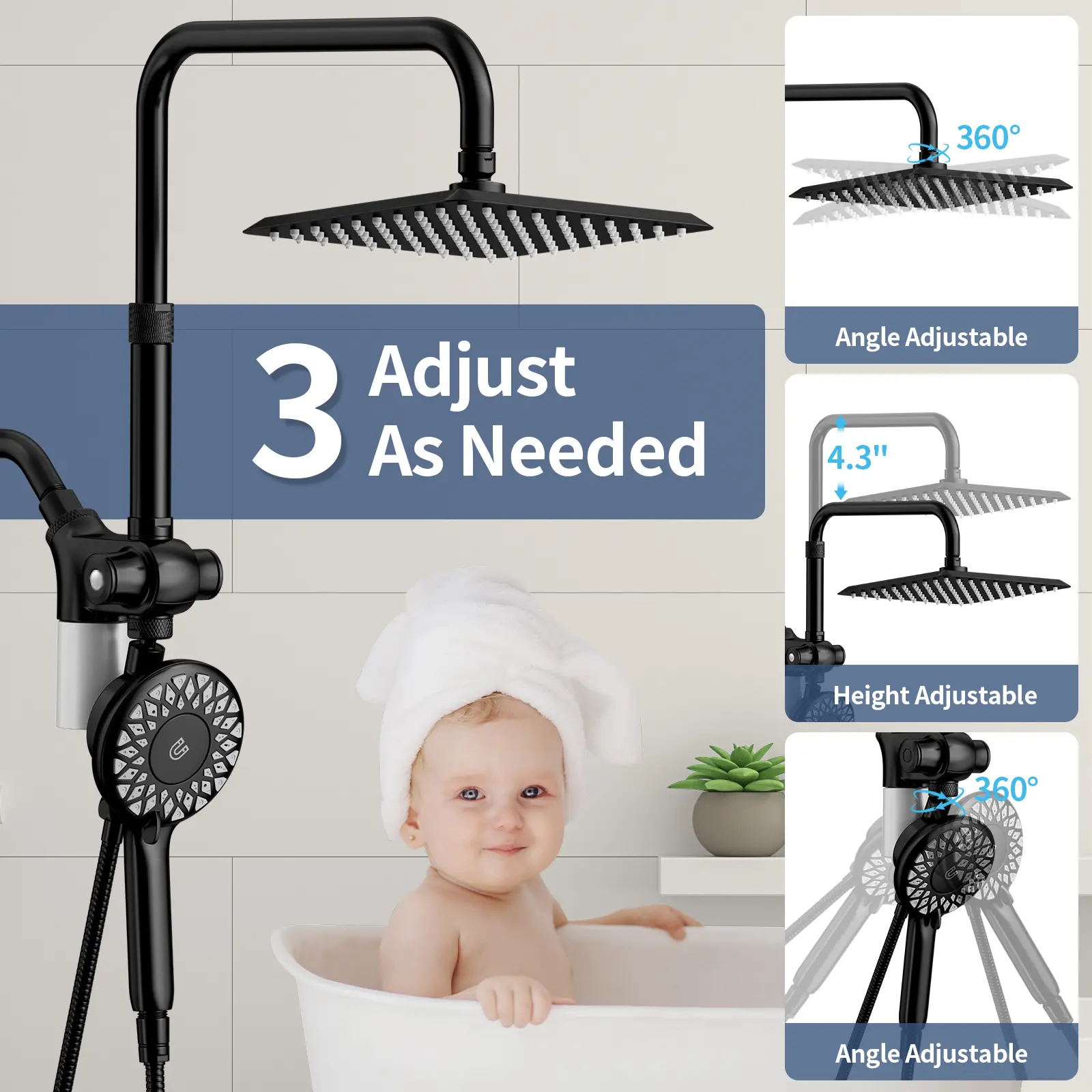 ·【10" Rainfall Shower Head】- The large 10-inch rainfall showerhead provides abundant water flow, covering a wide area for a full-body shower. Double shower head combofeels like being under a natural waterfall, making bathing more comfortable and relaxing. The rainfall shower head can rotate 360° and is height adjustable within 3.9 inches, allowing you to easily adjust the spray angle and height for a personalized shower experience.