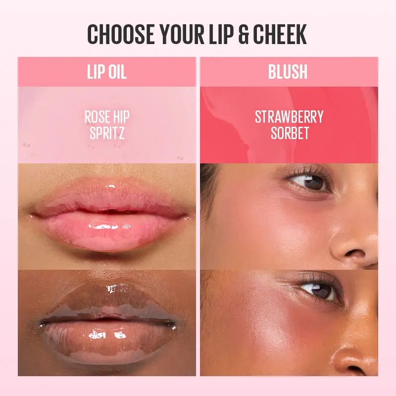 These high-shine glass lip oils come in a five shades and are paired with our touchless multi-stick, available in six fruit-inspired shades. Each formulated with lip-loving and fruit extract ingredients that nourish lips to achieve cheek and lip perfection.