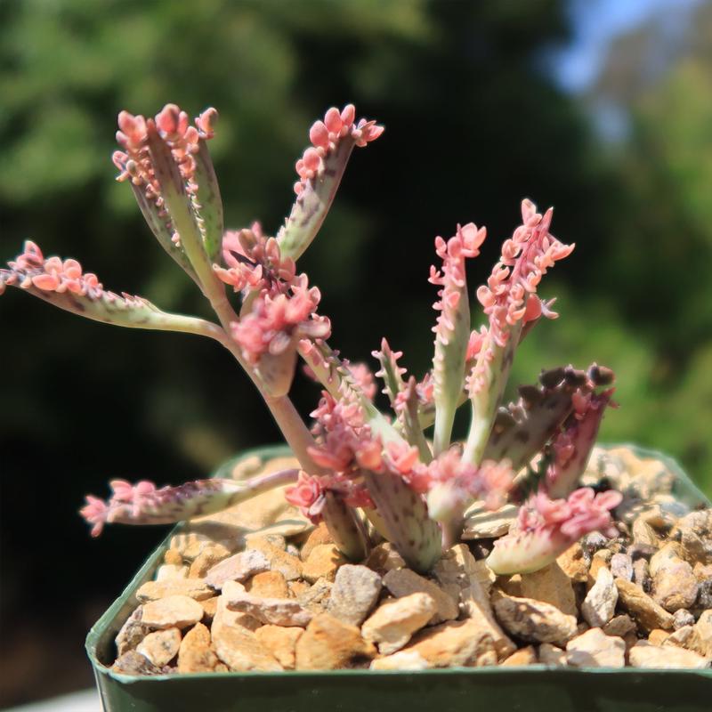 Native to Madagascar, this plant thrives in warm climates and is cherished by plant enthusiasts for its ornamental value and low maintenance requirements. This variegated cross between Mother of Millions and Mother of Thousands grows tall stems and long, thin leaves.