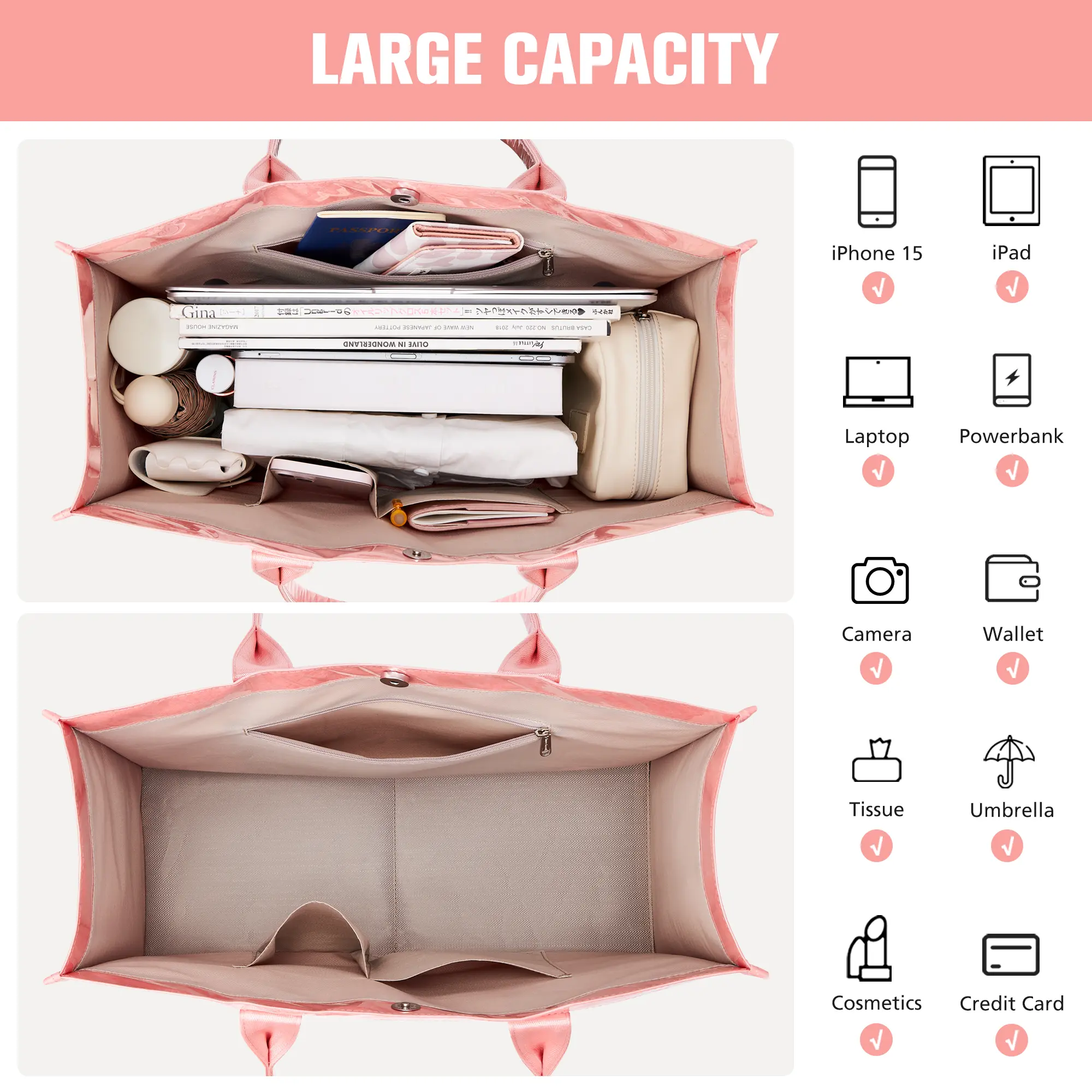 ·Large Capacity Handbag: Ladies large tote bag is designed to hold everything you need for travel, office, beach, or dating, including 15" laptops, iPads, wallets, books, cosmetics.