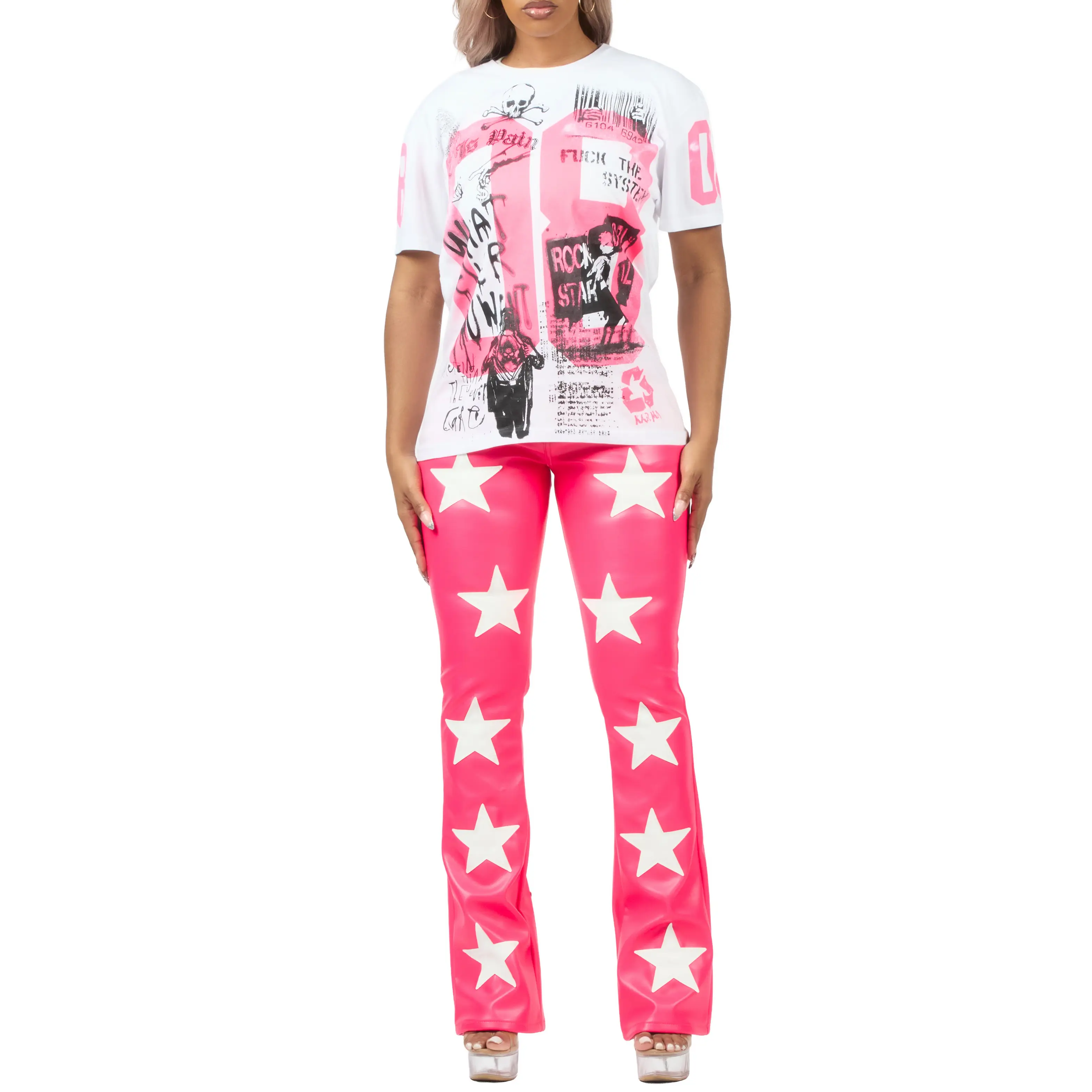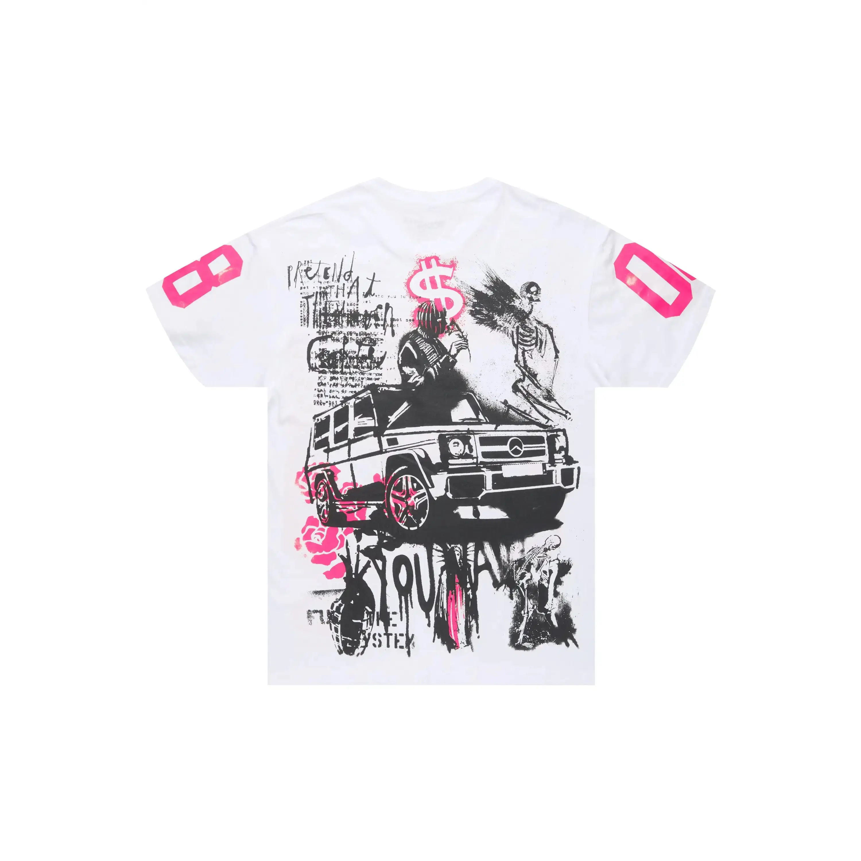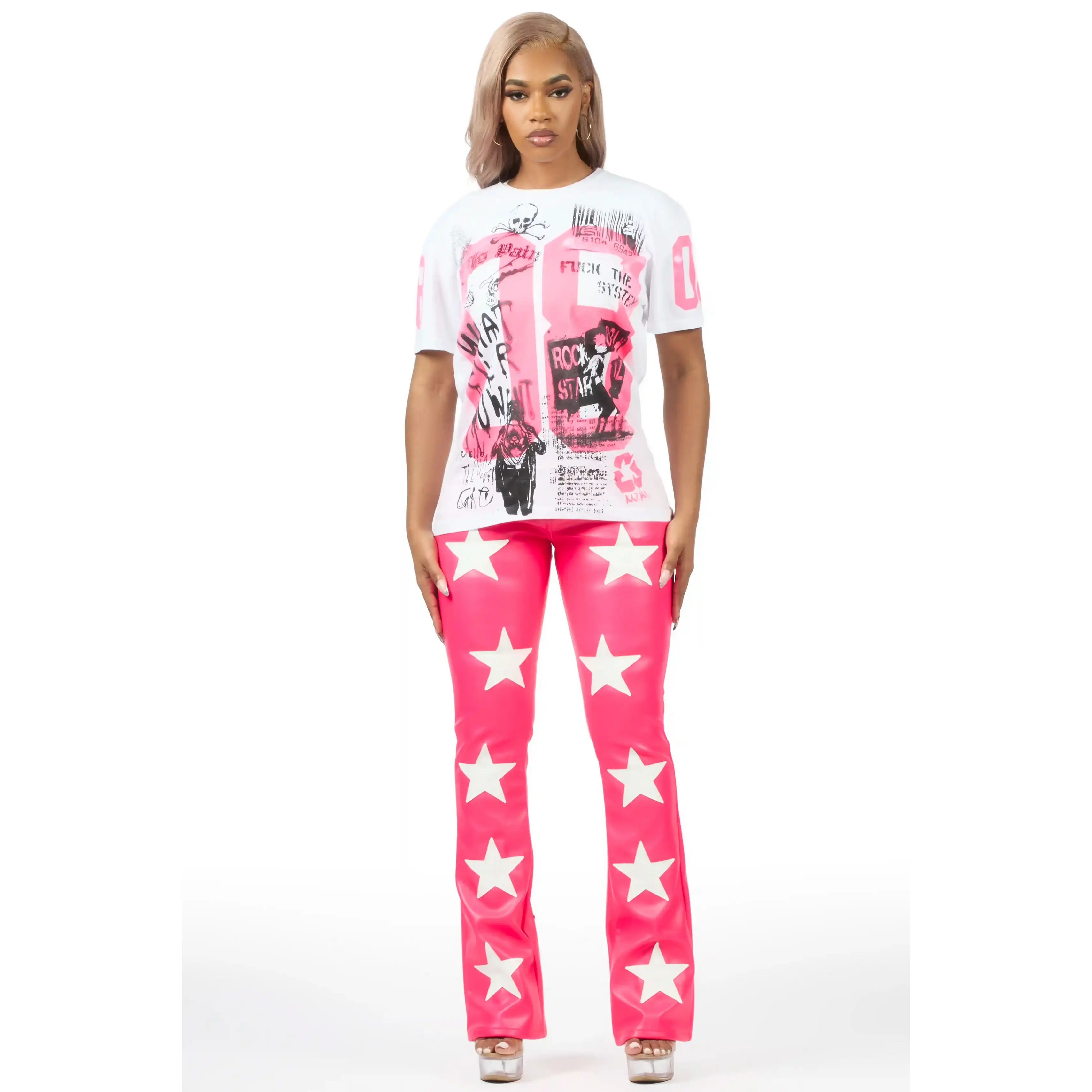 An urban streetwear t-shirt for women in white and pink. Designed with organic cotton and custom detailing for a must-have streetwear tee.