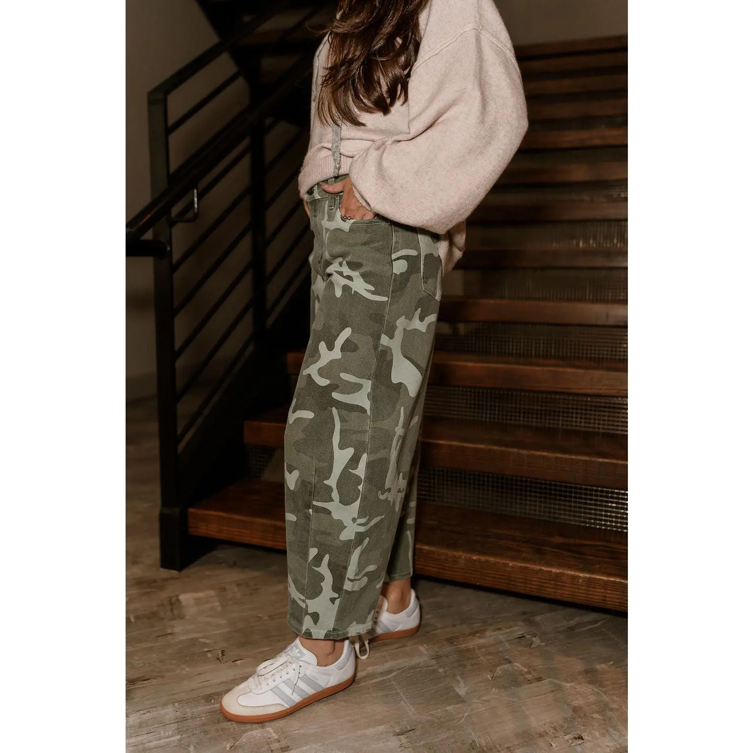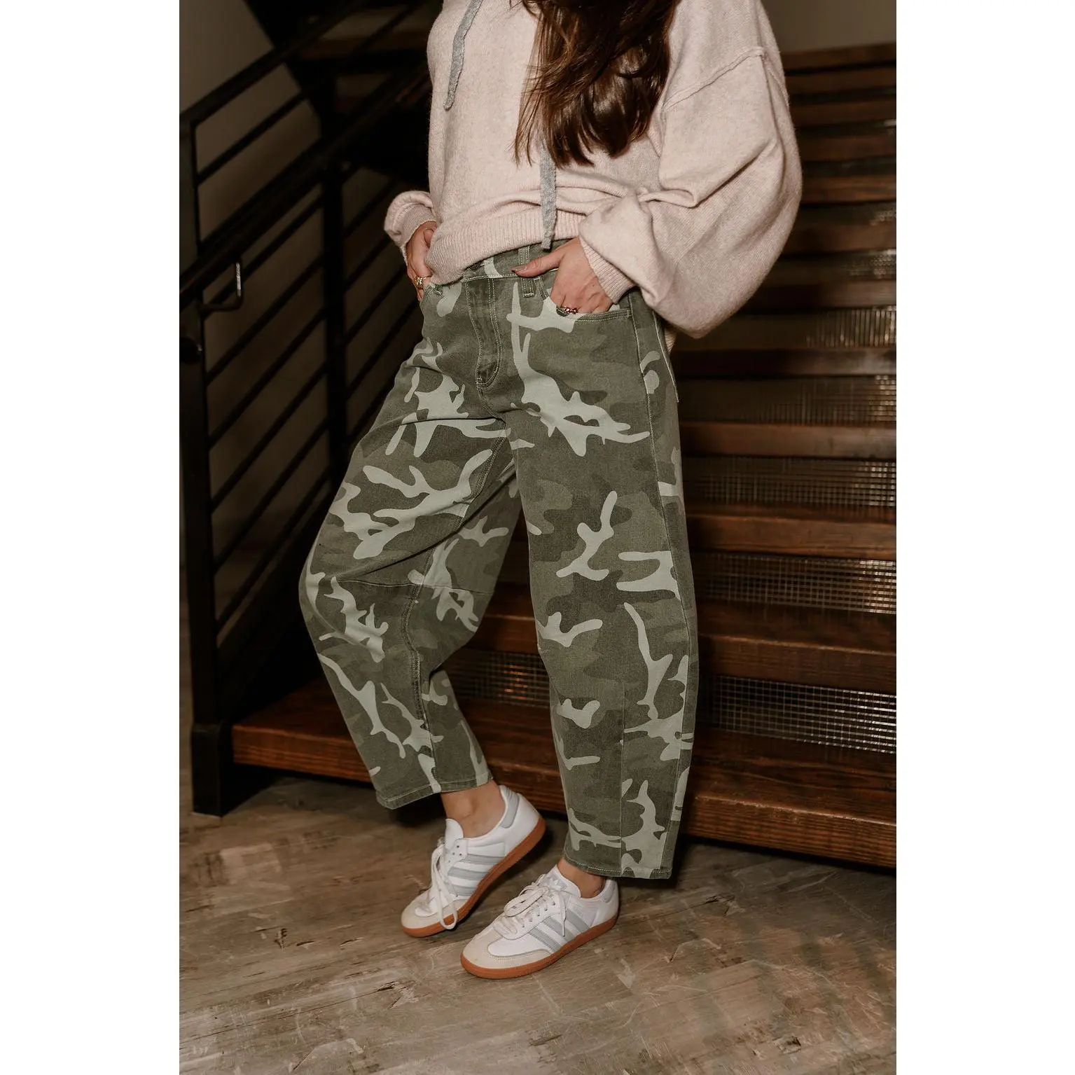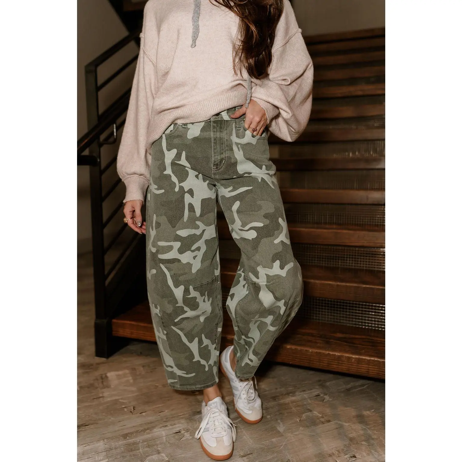 These jeans pair effortlessly with fitted tops, cropped sweaters, or basic tees for a balanced, on-trend look. Dress them up with a sleek boot or keep things casual with sneakers for weekend wear. Their unique shape and camo print make them a fun alternative to traditional denim, giving your wardrobe an instant style boost.