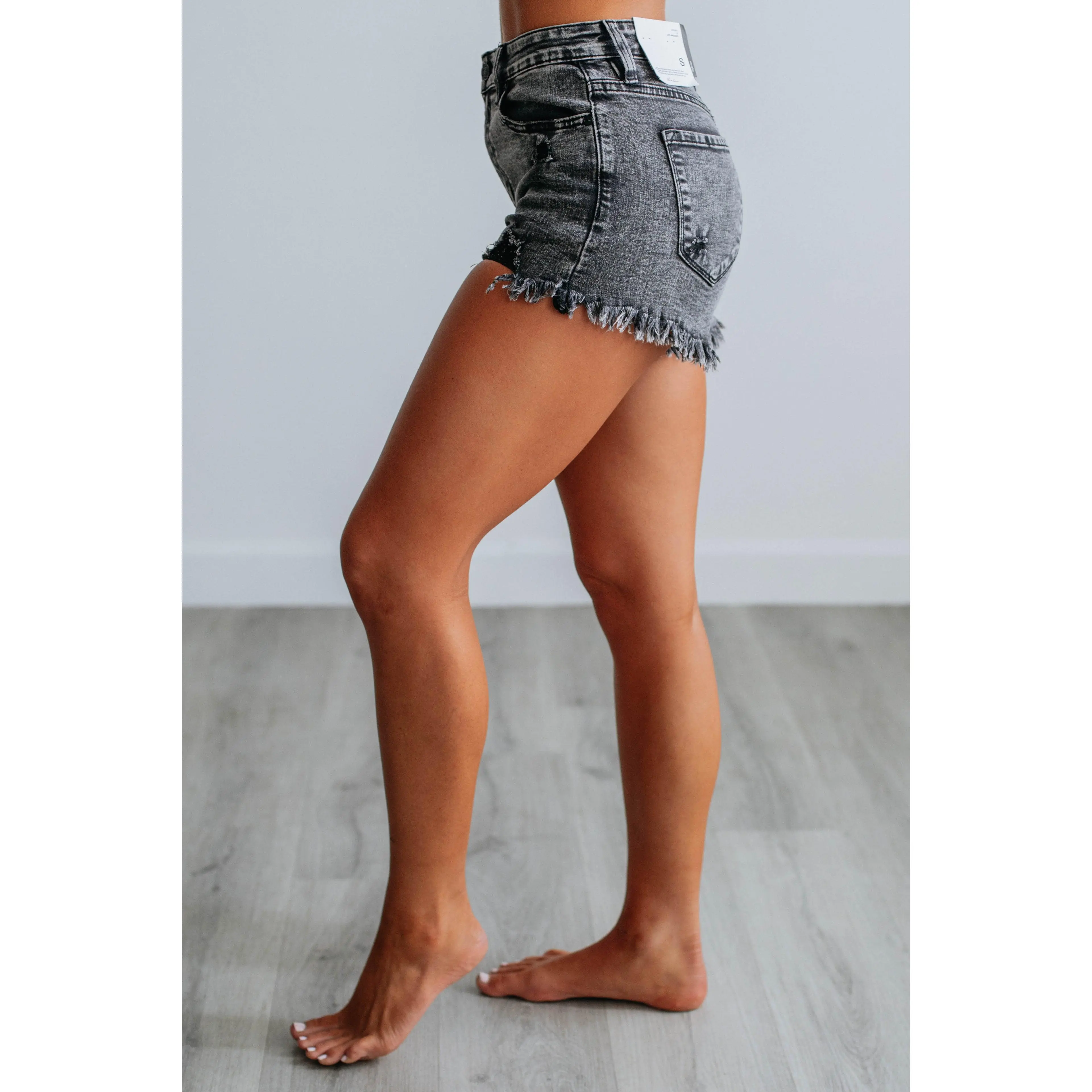 Black distressed Kancan shorts with frayed hem. These are the stretchy material. I’m a size 4/5 and wear a medium. #kancan #summerootd #summershorts #wildoakboutique #shortsforwomen
