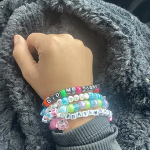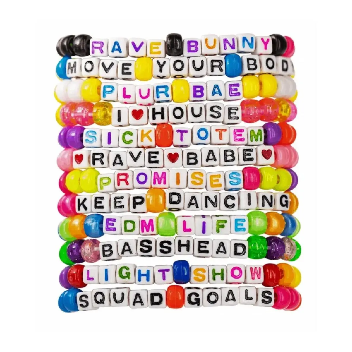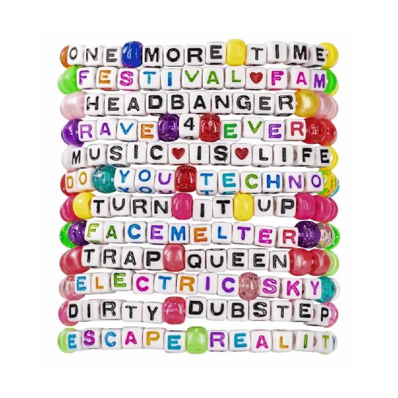 The Kandi Bar kandi bracelets are the perfect accessory for any rave or festival outfit. Each pack is unique and varies in phrases, making them a one-of-a-kind addition to any wardrobe. Made with premium 7mm pony beads, these bracelets are durable and long-lasting, ensuring that they can withstand wear and tear.