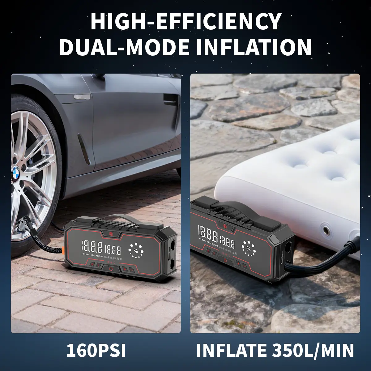 ·Compact and Portable: Combines a jump starter with an air compressor and blower.